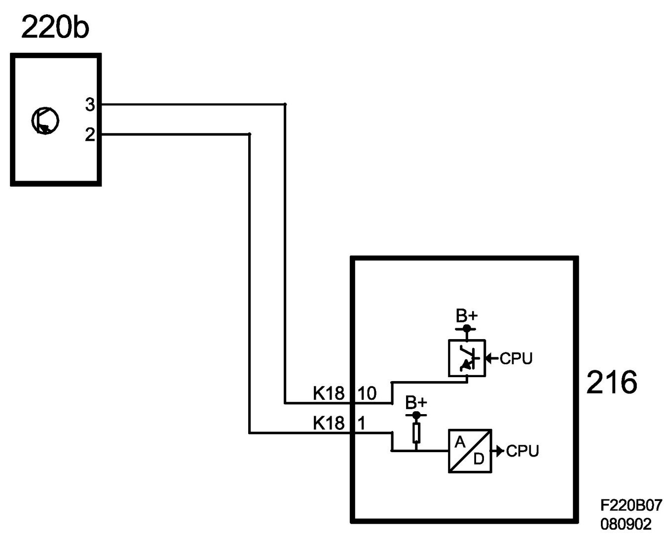 Fan control unit pin 2 is connected to ACC unit pin 1 (K18) with a return feed for diagnostics information. The control unit sends a 2 kHz PWM to the corresponding fan speed input. If a fault is detected, the control unit sends the indicated pulse ratio and the ACC unit generates the relevant DTC.