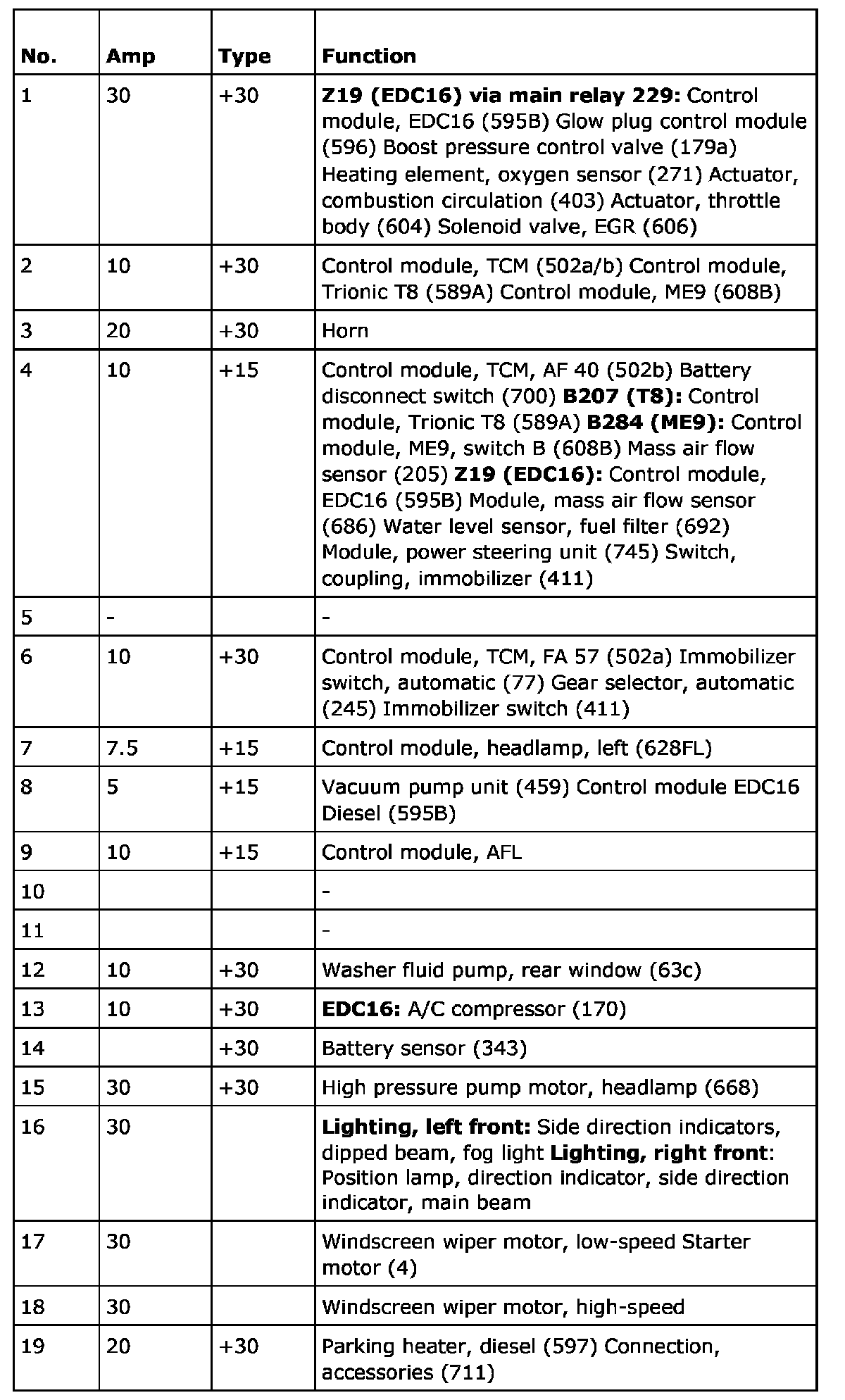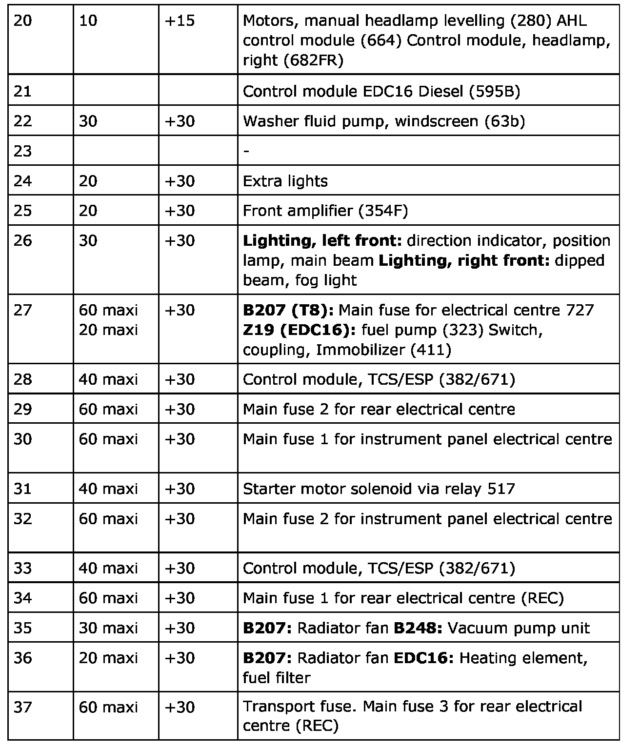 The electrical centre can contain a greater number of fuses than those with a function listed below. In such cases, these are not connected to the car's wiring harnesses.