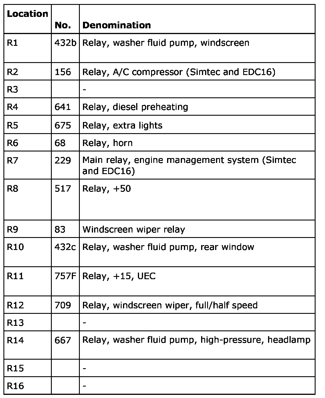 The electrical centre can contain a greater number of relays than those with a function listed below. In such cases, these are not connected to the car's wiring harnesses.