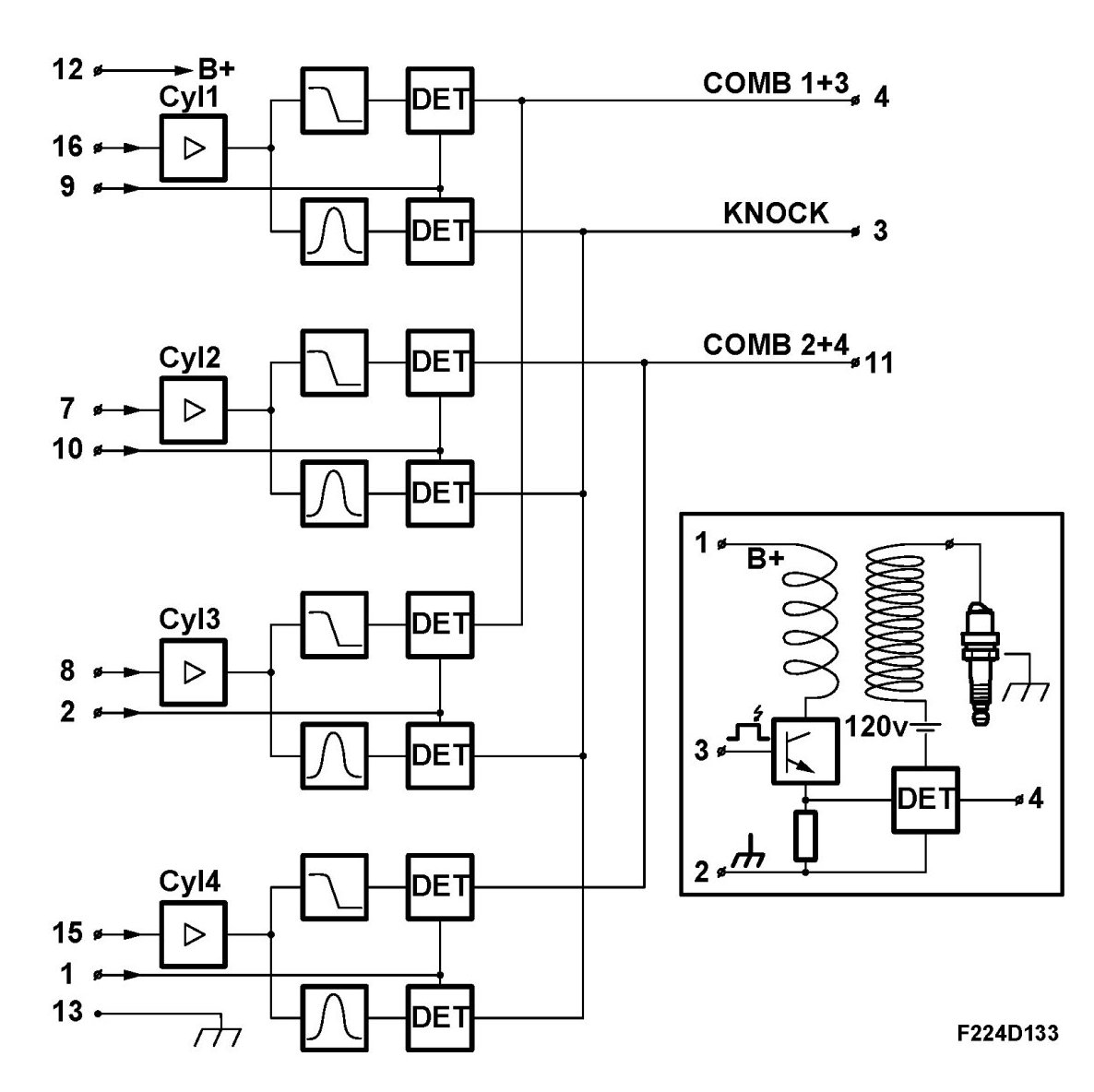 Suppose a spark has been generated in cylinder 1 and 4. CDM will detect this because it is connected to the ignition trigger line of the respective ignition coils. CDM analyses the ionization signal from ignition coil pin 4 for cylinder 1 pin 16 and cylinder 4 pin 15 on CDM.
