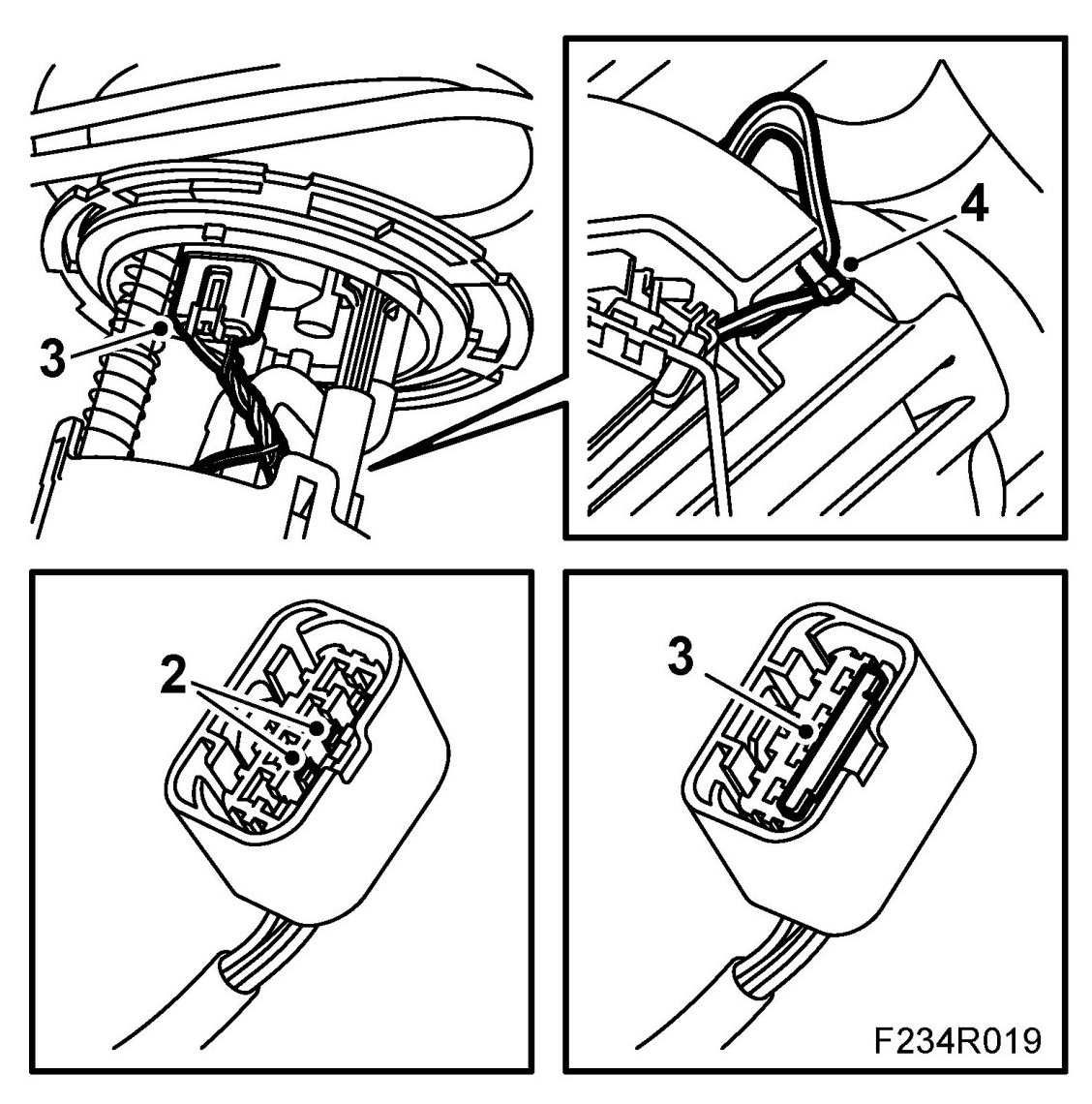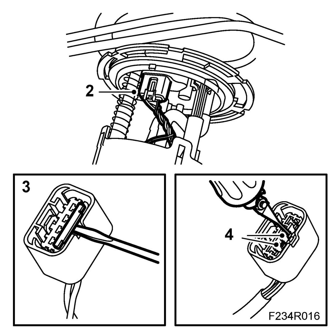 2. Connect the fuel level sensor cables to the connector. Pin no. 2 (grey cable) and pin no. 3 (white cable).