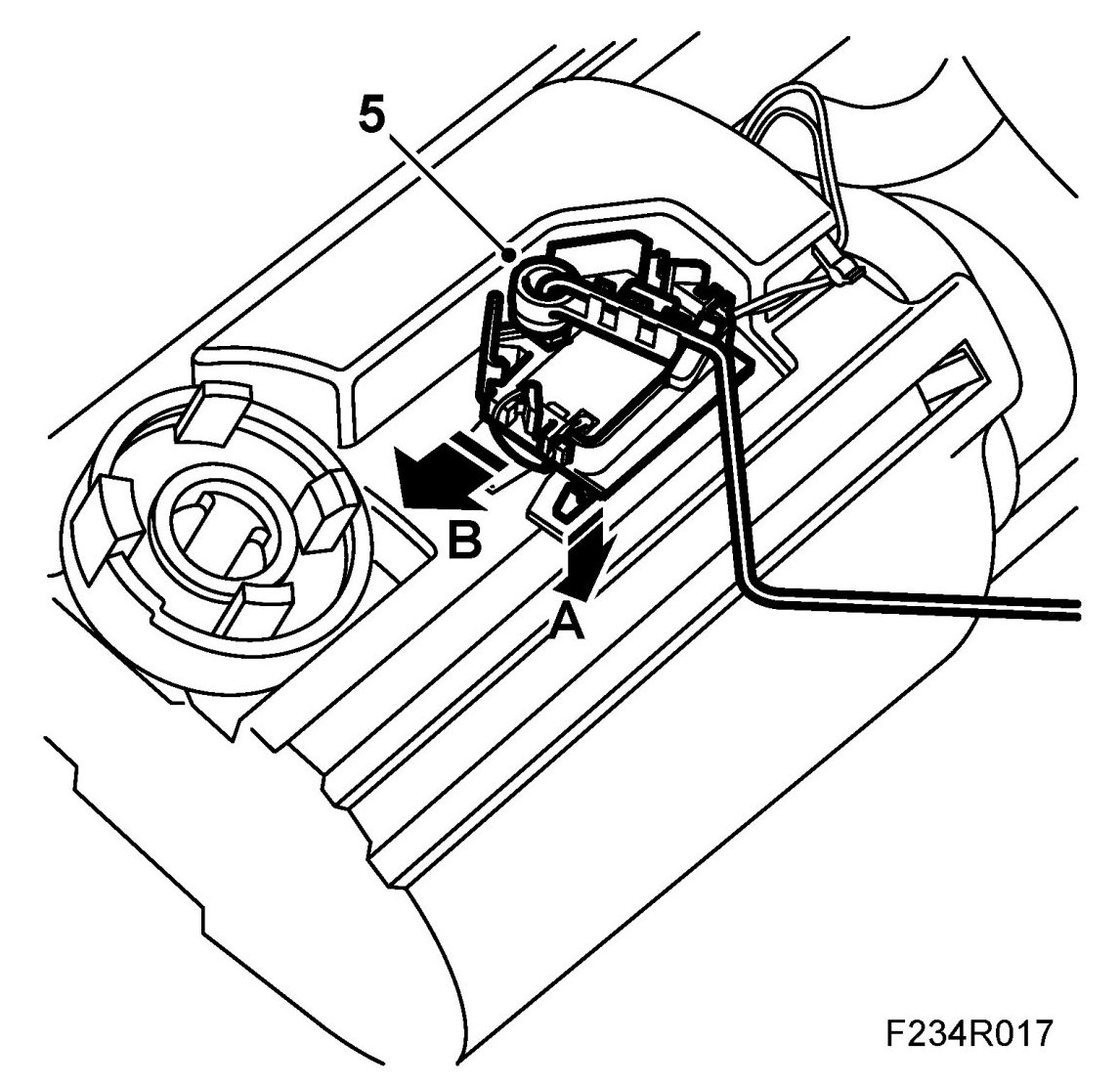 4. Prise out the fuel level sensor cable terminal, pin no. 2 (grey cable), pin no. 3 (white cable), with cables from the connector. Use 85 80 151 Kit, connector pin removal tool.