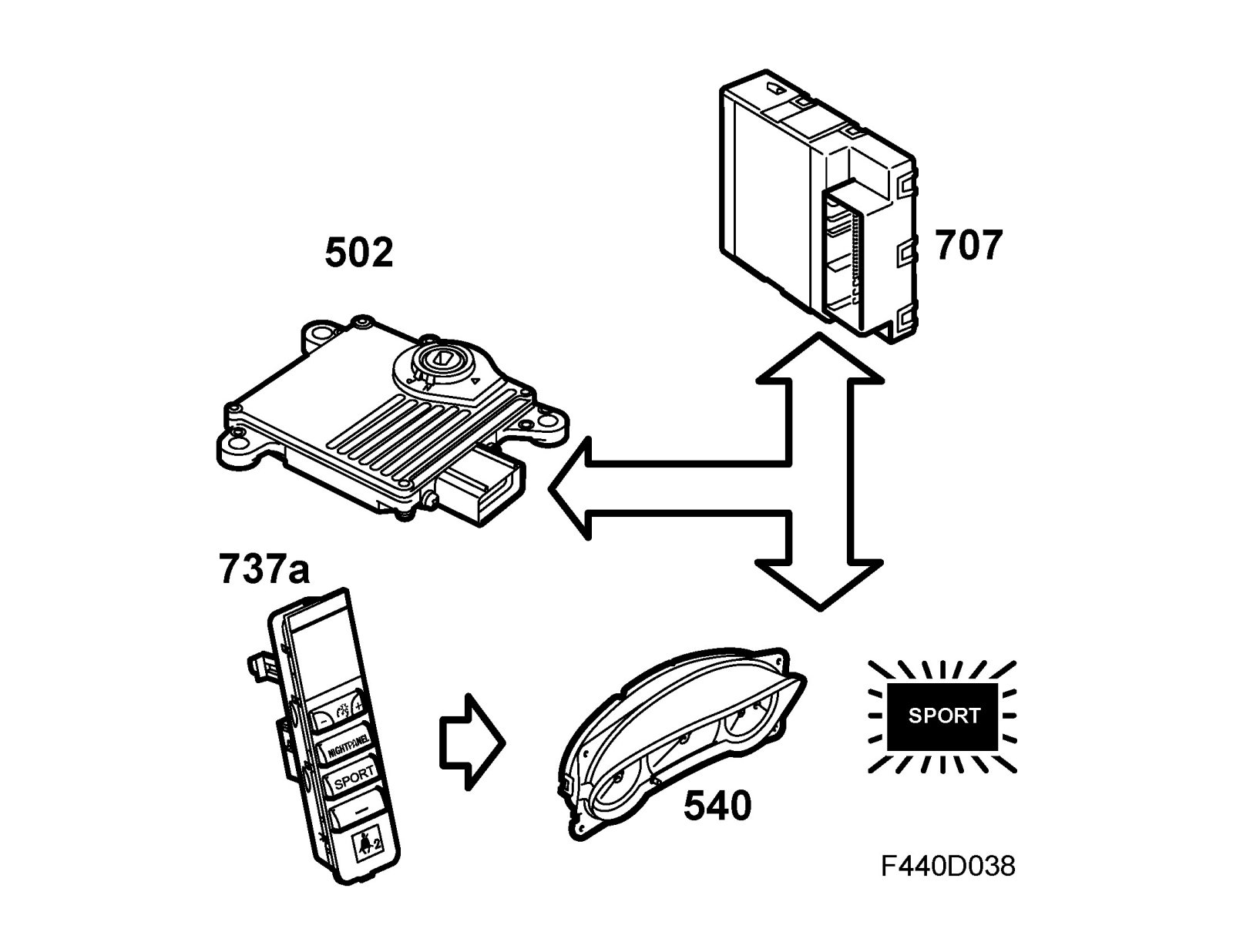BCM (707) transmits information on the current gearchange program on the bus - SPORT program ON/OFF (used by MIU (540) and TCM (502)). When SPORT is active, bus information "SPORT ON" is transmitted. In this mode, the shifting pattern is change, with upshifts at a higher rpm and downshifts at a lower rpm.