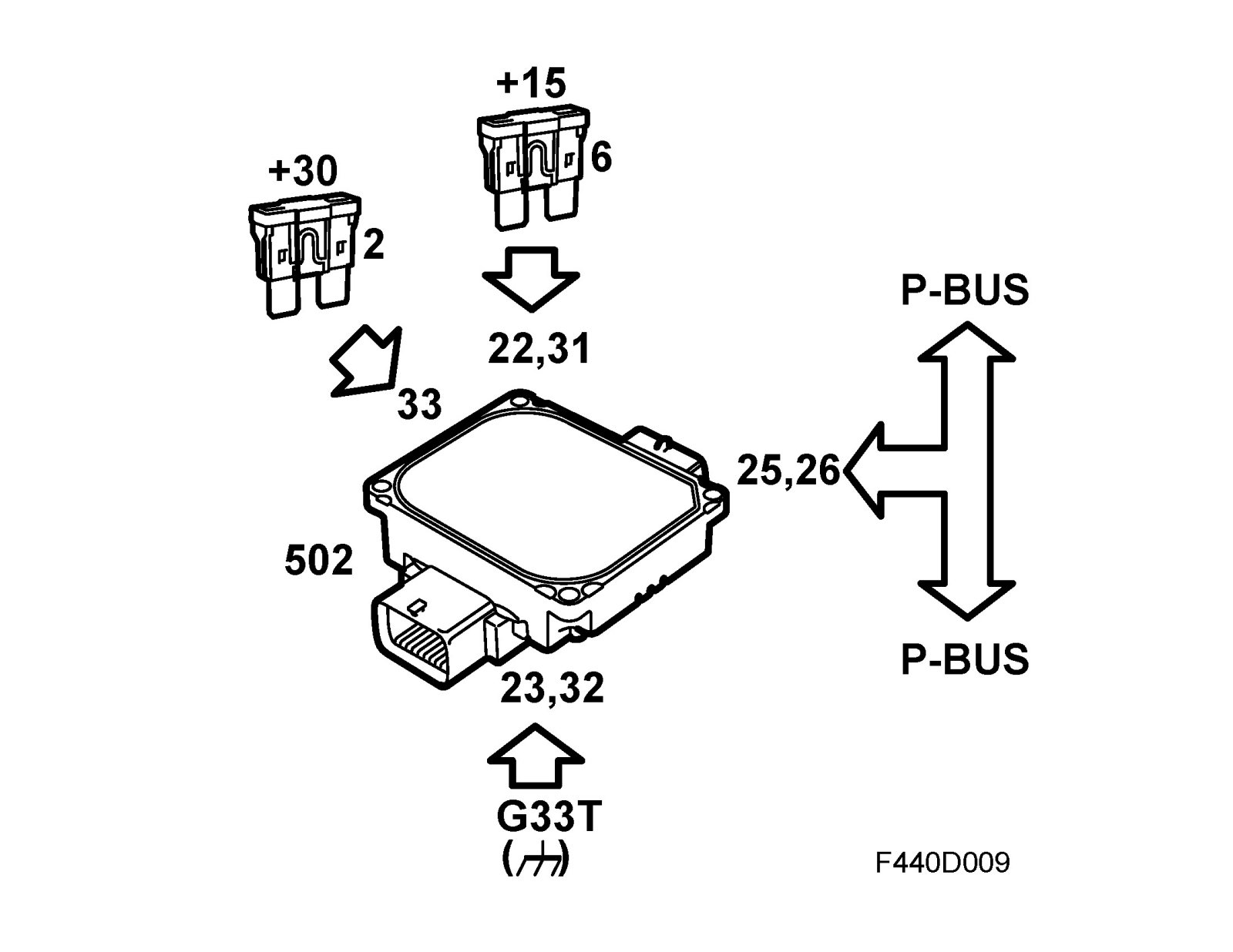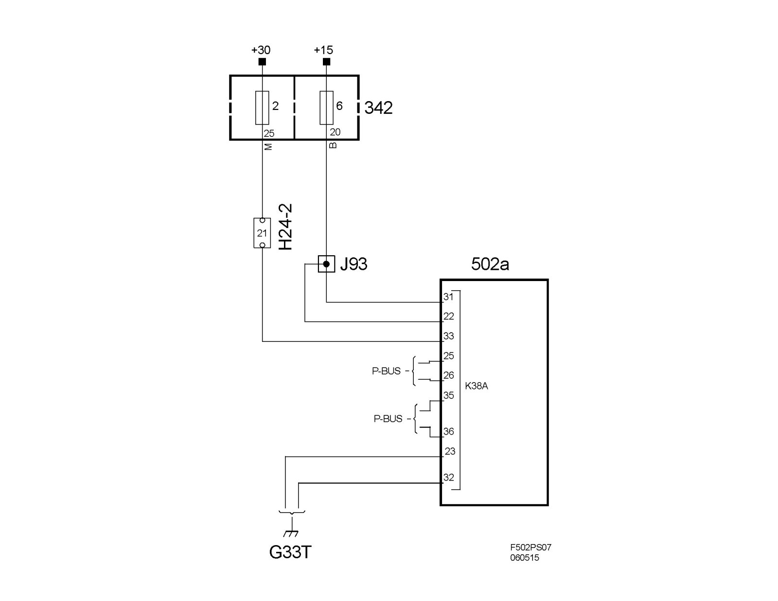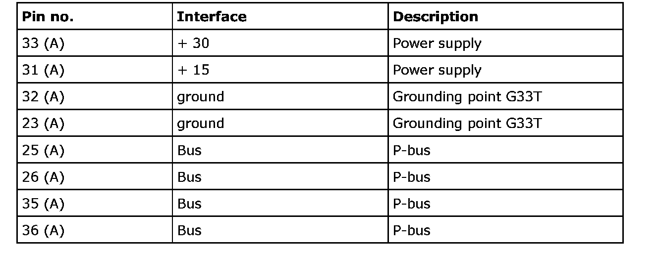 The control module is powered on pin 33 (A) with +30 voltage and on pins 31 (A) and 22 (A) with +15 voltage. The module is grounded via pins 32 (A) and 23 (A) to grounding point G33T. Bus communication (P-bus) takes place on pins 25-26 (A) and 35-36 (A).