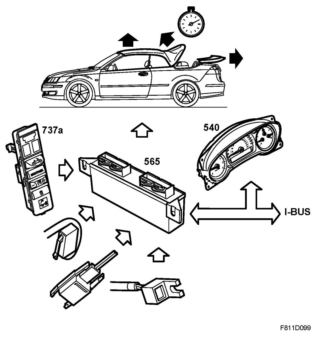 The driver requests the opening or closing of the soft top with the switch or the remote control. The STC control module operates the soft top hydraulically using information from a number of position sensors integrated in the mechanism's cylinders.