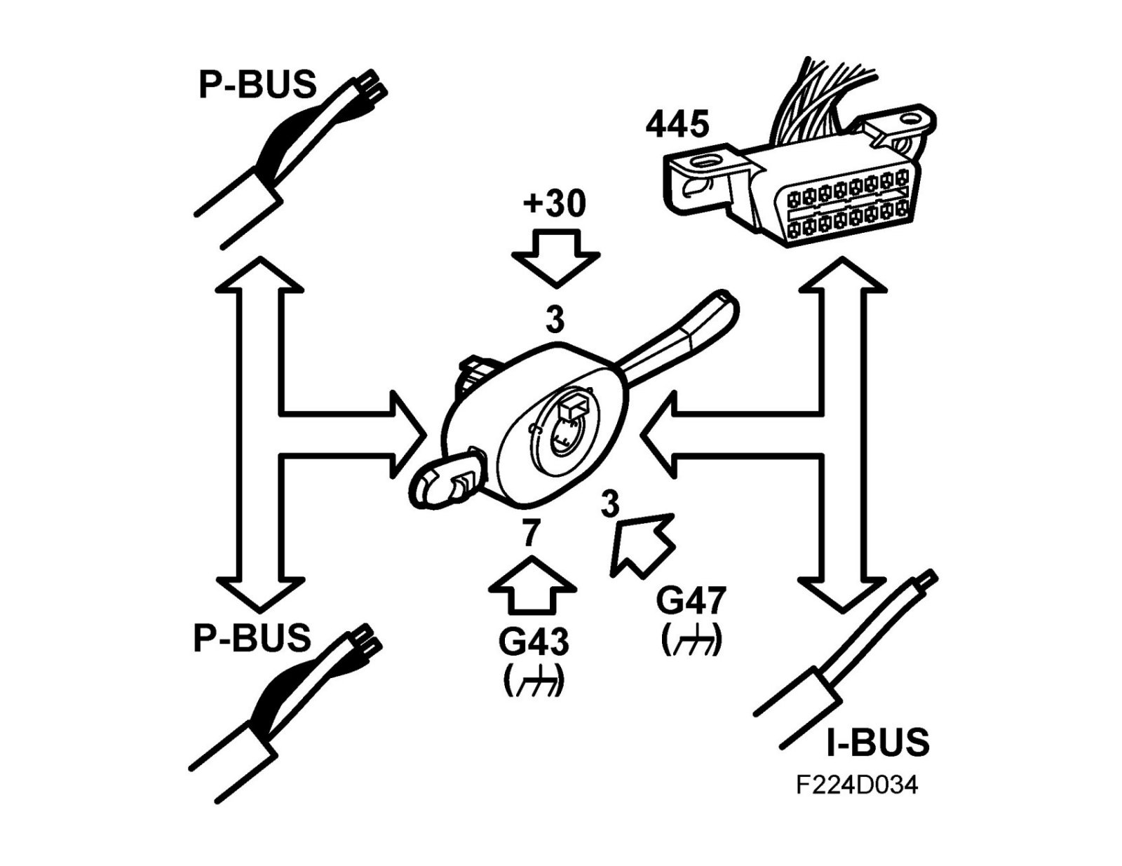 The sensor contains 4 Hall sensors and a microprocessor. The CIM continuously sends steering wheel angle information on the bus. 0° corresponds to a straight ahead position; a value which increases when the steering wheel is turned to the left. The sensor must be calibrated after changing the straight ahead position of the steering wheel or steering wheel replacement. Sensor fault requires CIM replacement.