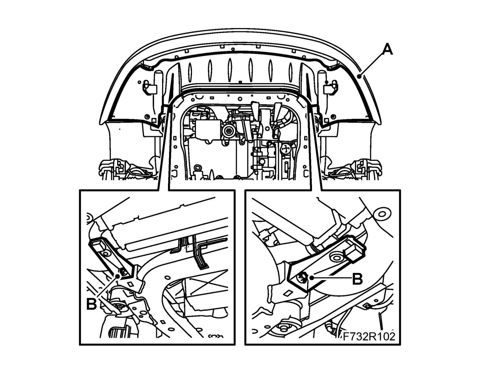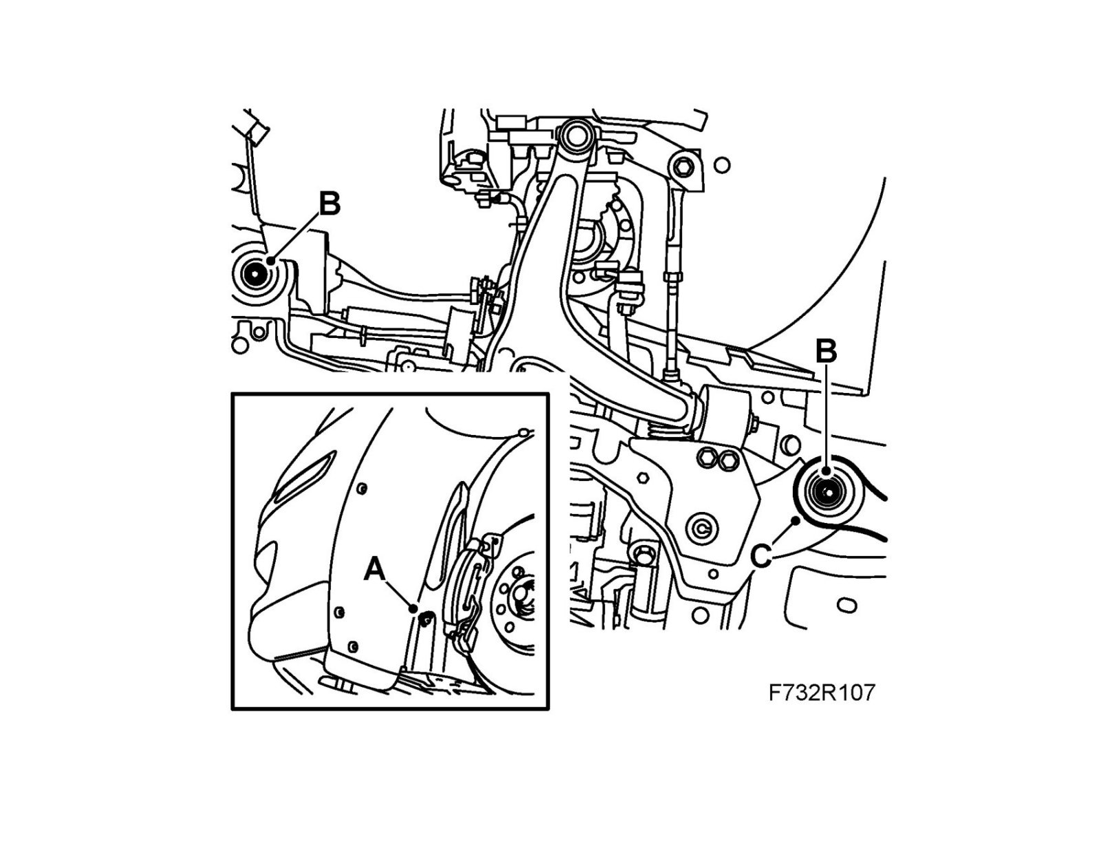 8. Lift the subframe so that the inner sections of the bushes are pressing against the body. Fit the front subframe bolts (B) on both sides.