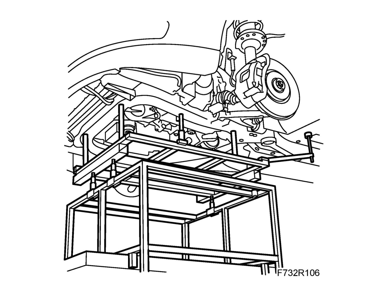 6. Lift the subframe into place and align 83 96 137 Centering tool, subframe - body with the locating holes in the body.