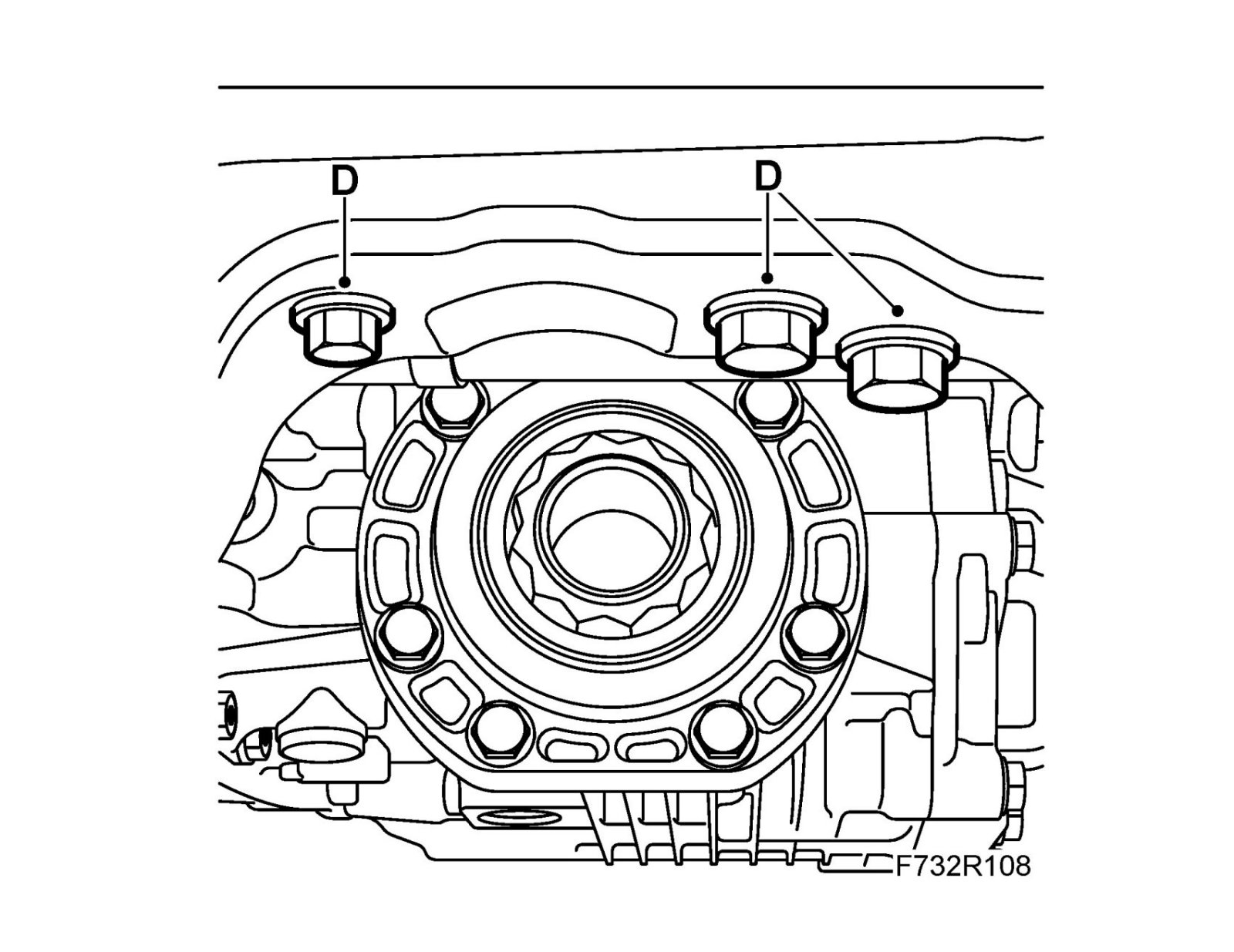 17. Remove the bolts (D) holding the rear torque rod to the subframe.