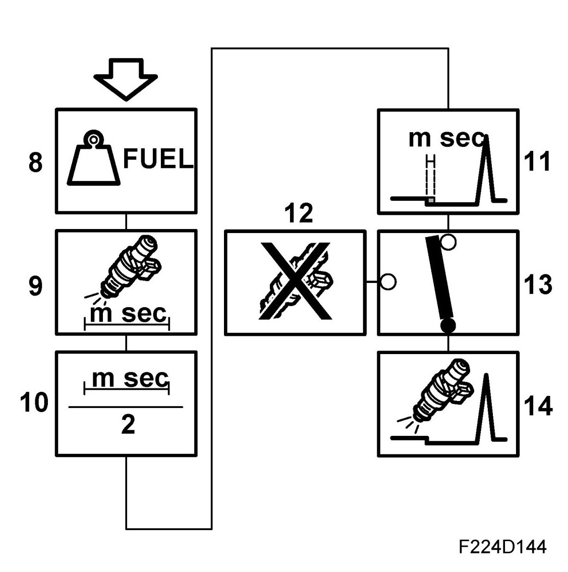 The ECM controls the injector which is currently supplying fuel, and the sequence is controlled by the ignition sequence. The camshaft angle at which injection takes place depends on the prevailing operating conditions.