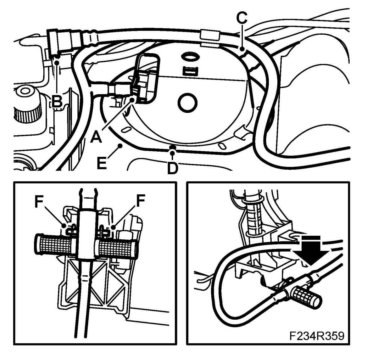 2. Insert the fuel level sensor in the tank and snap on the sensor's bracket (F) in the right position.