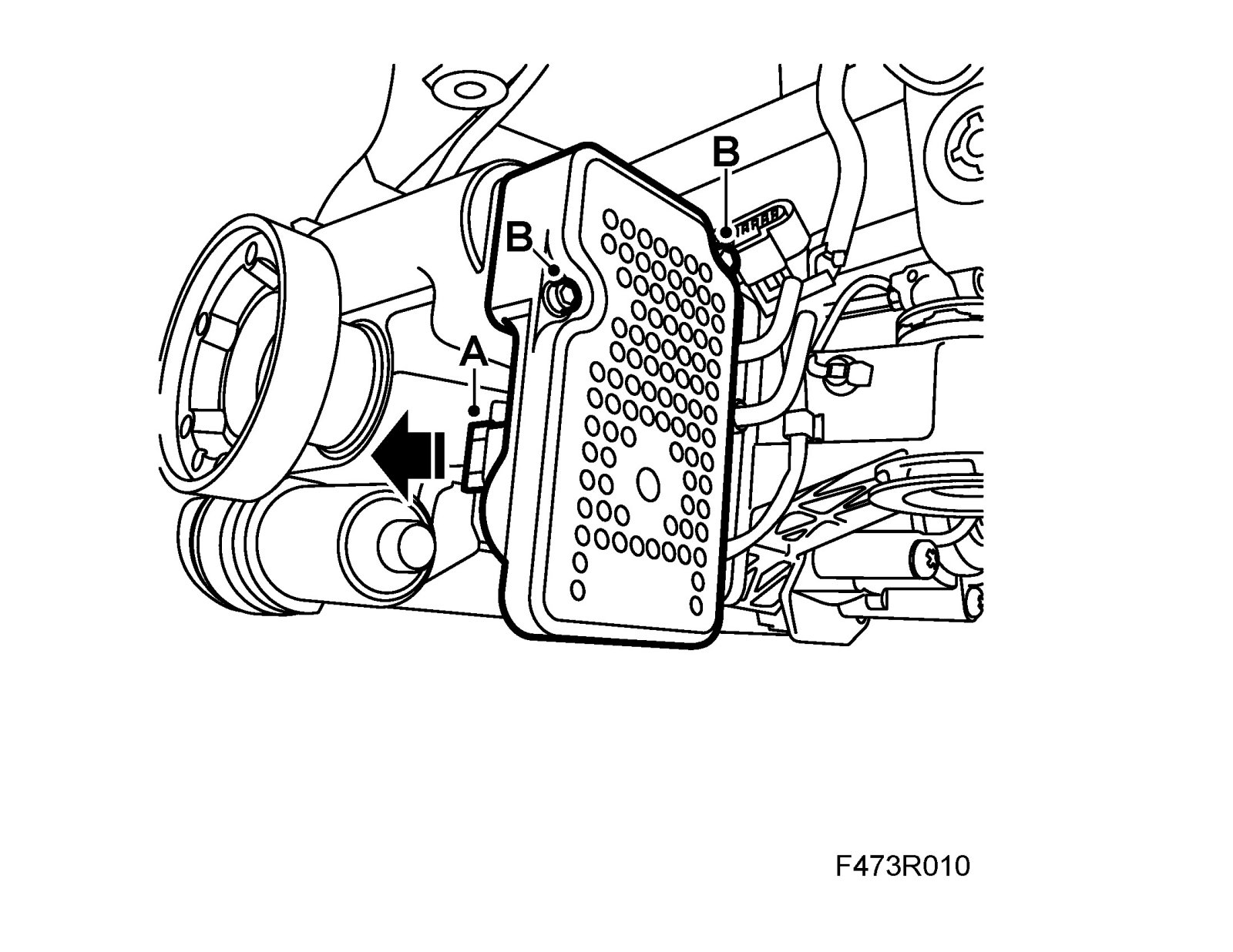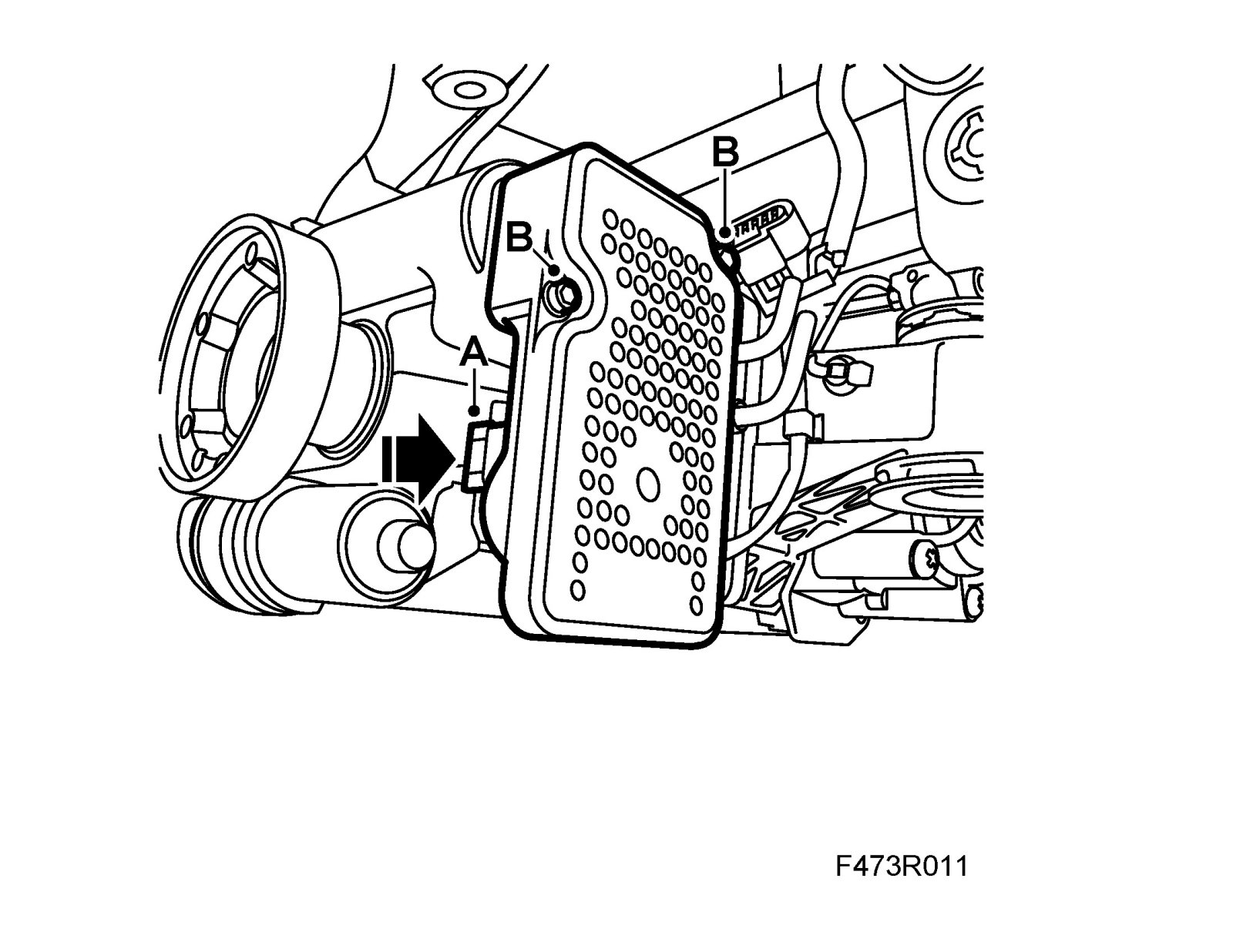5. Unhook the hooks (A) from the control module and remove the protective cover (B) from the hydraulic pump.