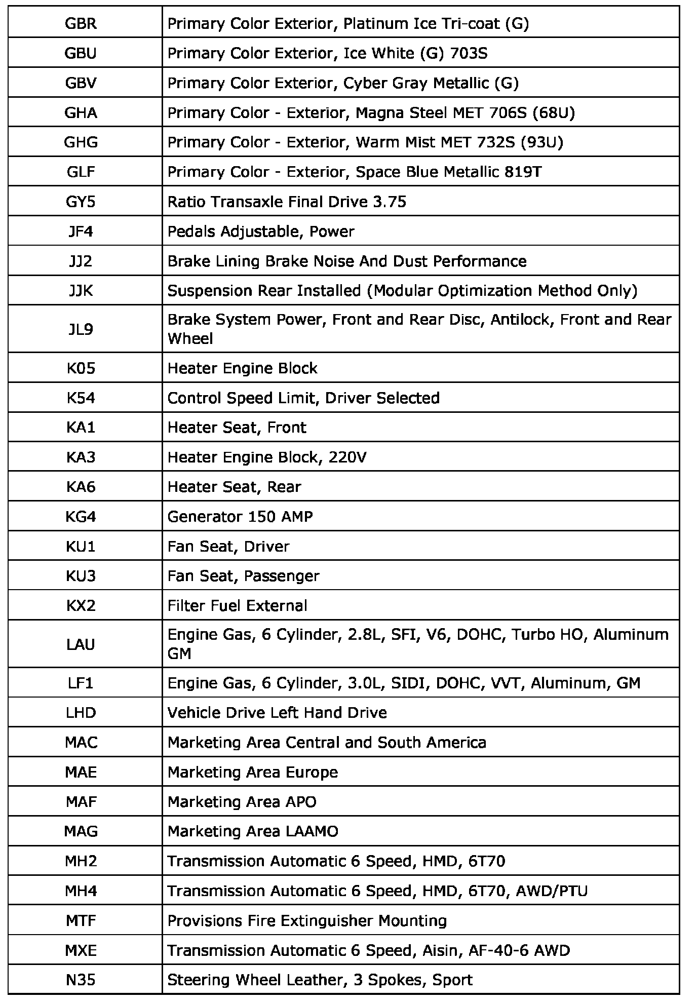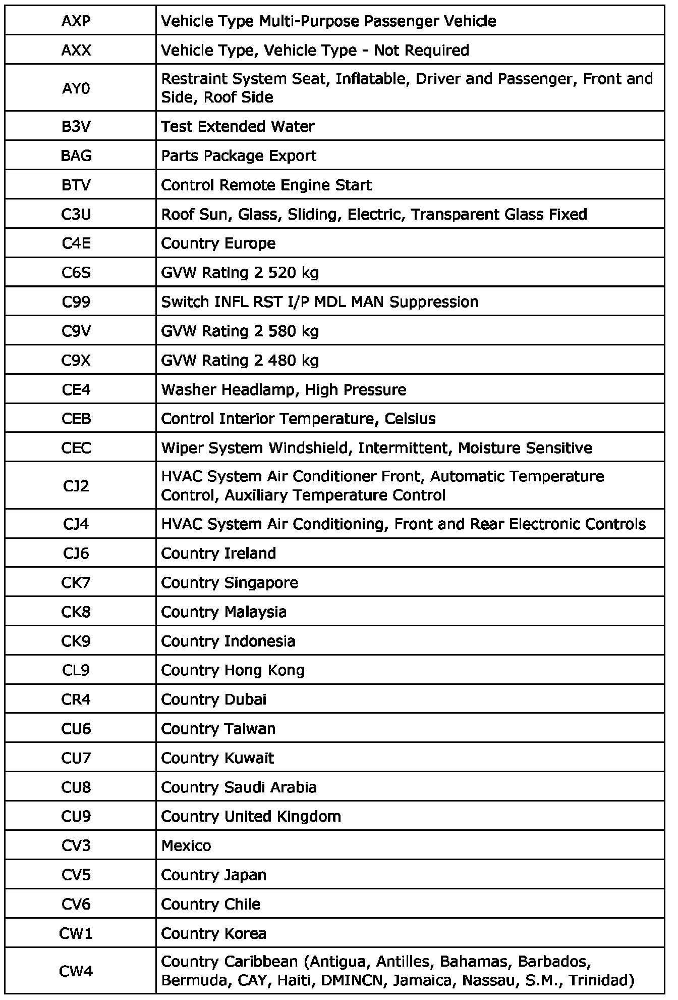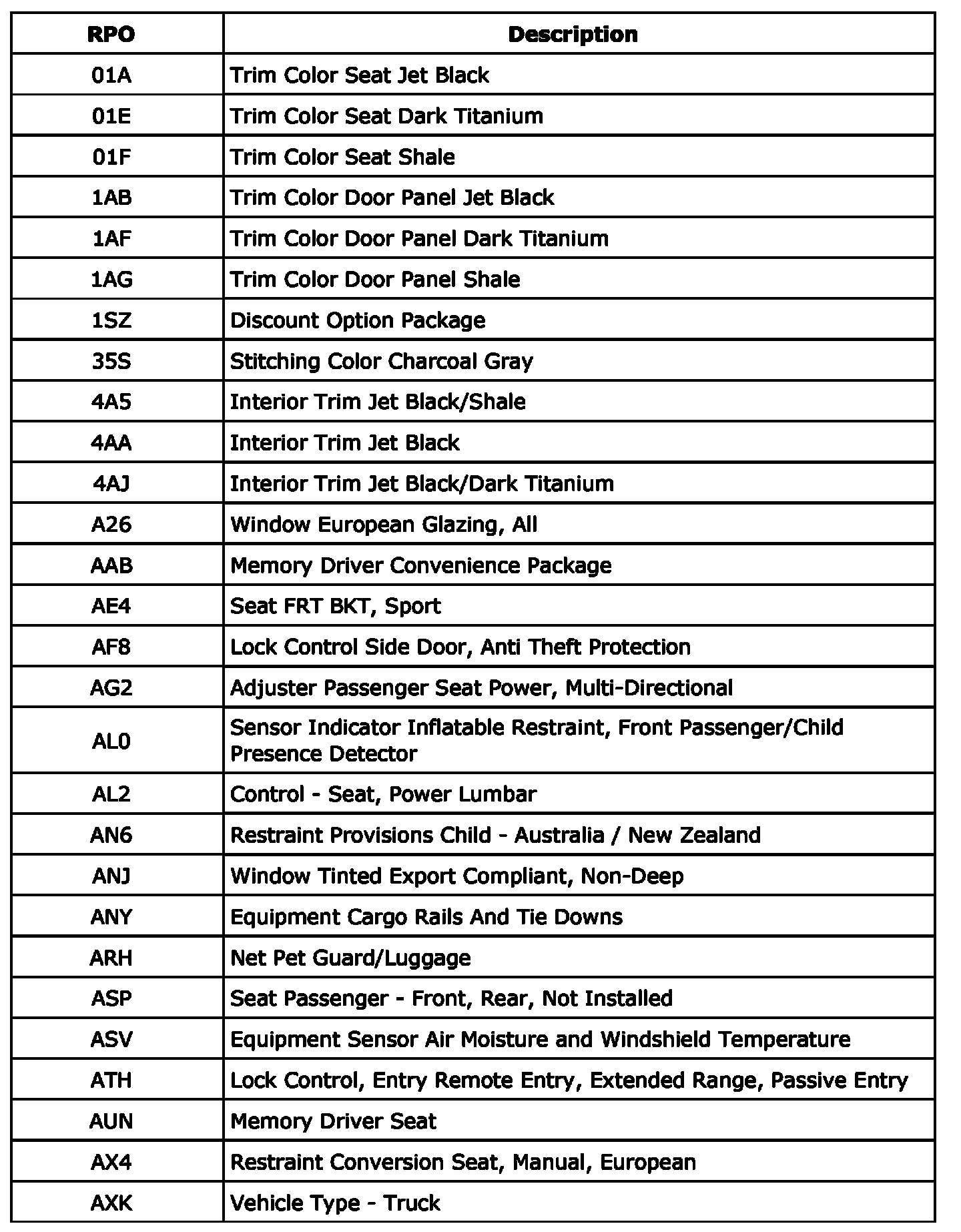 The following table provides the description of the Regular Production Option (RPO) codes that are available on the vehicle. The vehicles RPO list is printed on the Service Parts Identification Label.