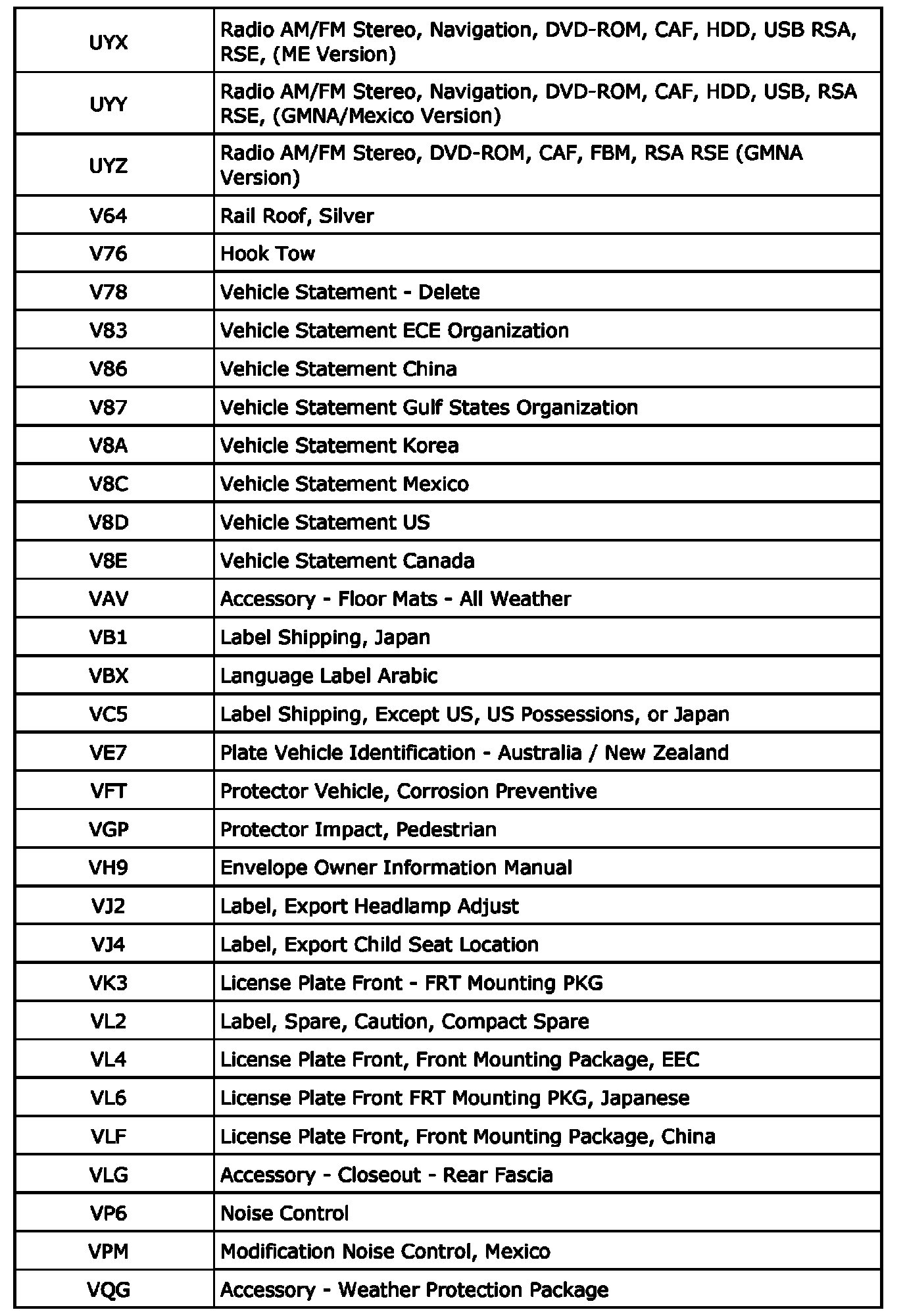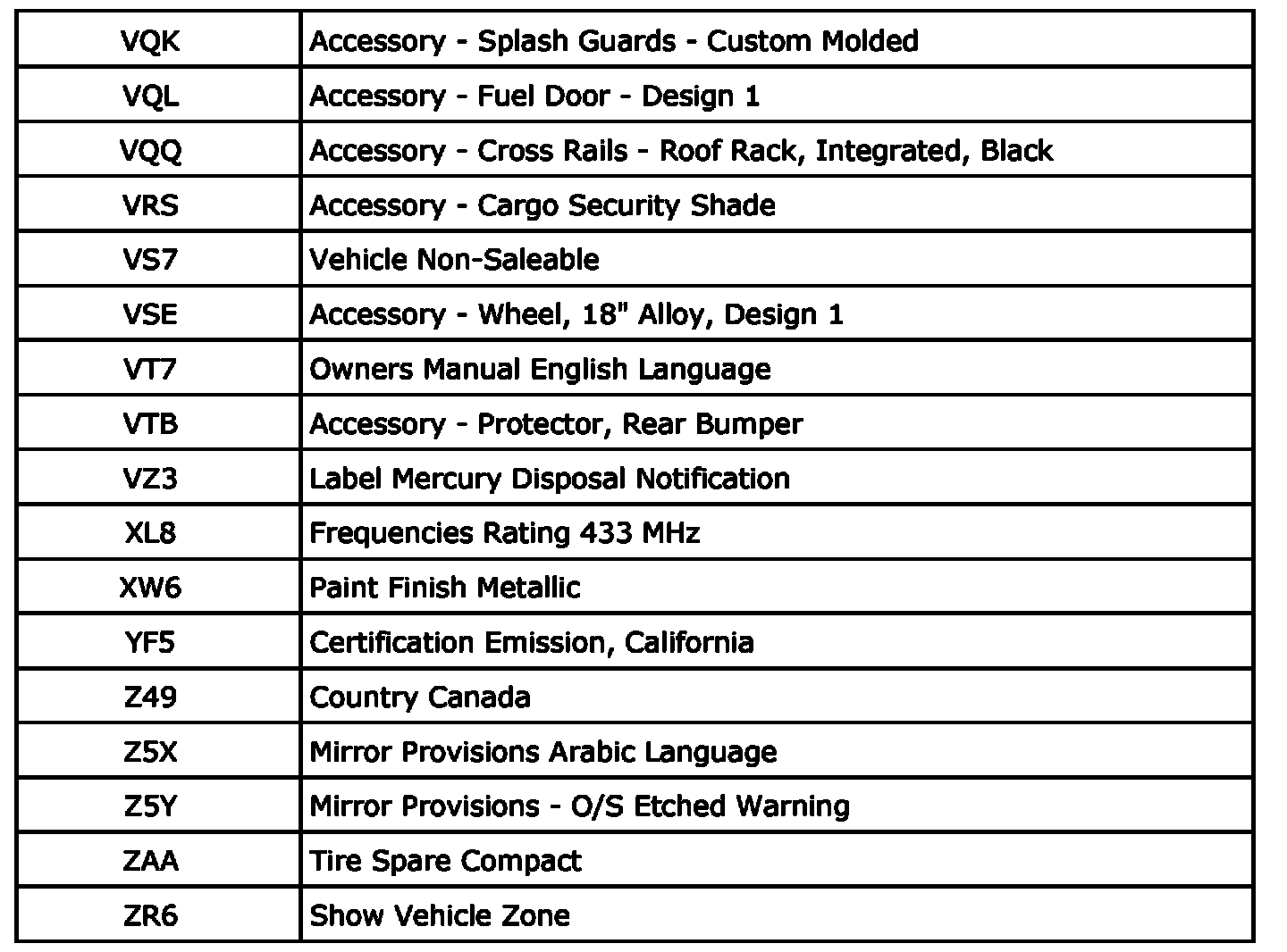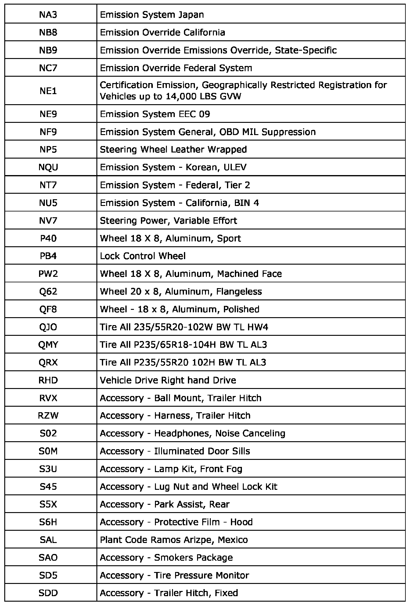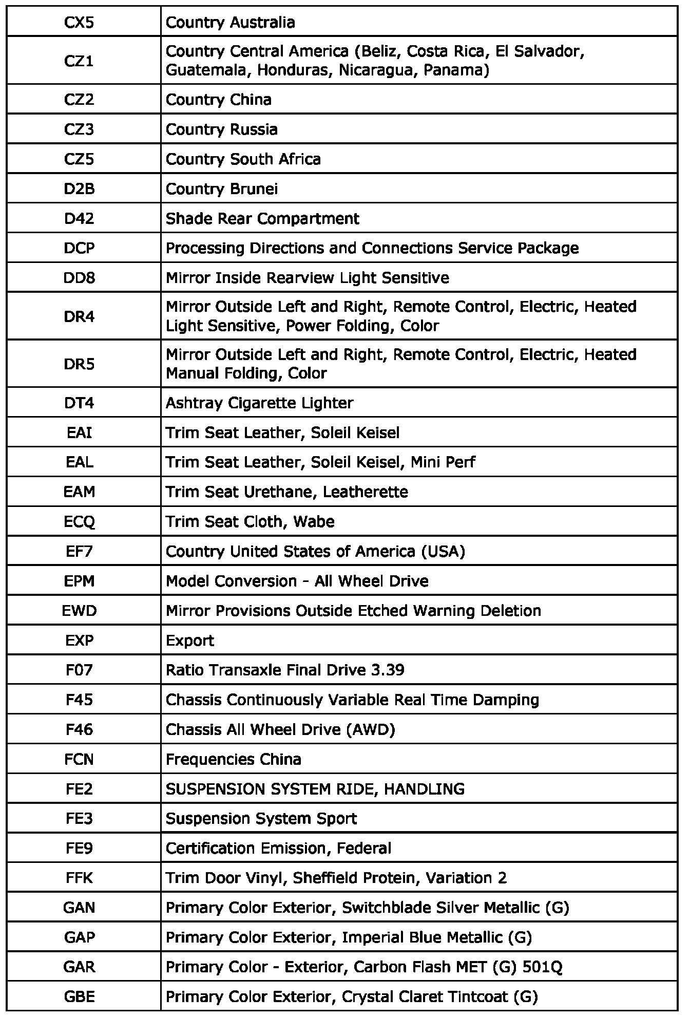 The following table provides the description of the Regular Production Option (RPO) codes that are available on the vehicle. The vehicles RPO list is printed on the Service Parts Identification Label.