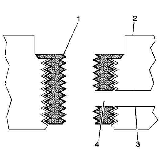 6. Apply threadlock sealant, EN 42385-109, LOCTITE 277(R) or equivalent (1) to the insert OD threads (2). Refer to Adhesives, Fluids, Lubricants, and Sealers for recommended sealant.