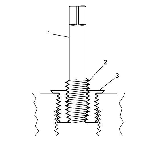9. In order to tap the new threads for the insert to the proper depth, rotate the tap into the cylinder head bolt hole until the mark (3) on the tap aligns with the top of the drill bushing (2).