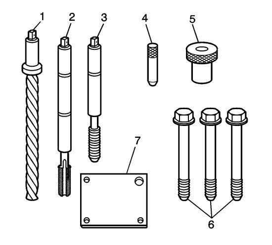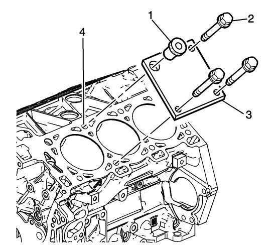 1. Position the fixture plate (3) with the bushing (1) installed over the cylinder head bolt hole to be repaired (4).