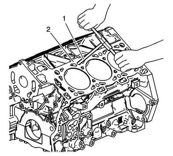 22. In order to completely form the new threads in the insert, rotate the driver installation tool through the insert until the mark (1) on the driver installation tool aligns with the surface of the engine block deck (2).