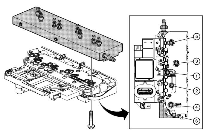 2. Bolt the DT-47825-100 test block to the control solenoid (w/body and TCM) valve assembly on the valve body mounting surface. Use the bolts and washers supplied with the tool to attach the test block. Tighten the bolts to 5 Nm (44 lb in) using a center out alternating torque sequence.