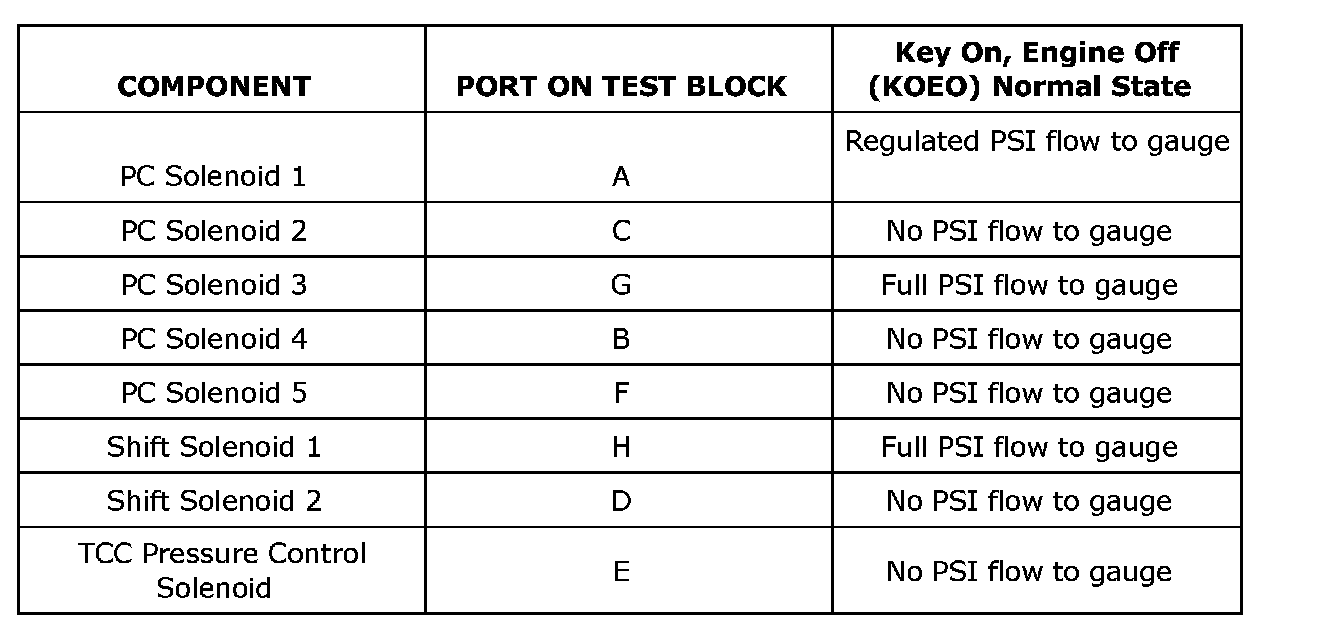 The purpose of this procedure is to test the functionality of the control solenoid (w/body and TCM) valve assembly solenoids for a gross stuck open or stuck closed condition. The DT-47825-100 test block is bolted to the control solenoid (w/body and TCM) valve assembly on the valve body mounting surface. Pressurized air is passed into the aluminum test block, through the control solenoid (w/body and TCM) valve assembly solenoid passage and back to a pressure gauge on the test block. The pressure gauge indicates open if air pressure is passed through the solenoid, or closed if the solenoid is unable to pass air through. A diagnostic tool is used to control the solenoid valves ON and OFF. The valve function can be decided when looking at the pressure gauge. The recommended shop air pressure for this test is 90-100 psi.