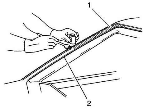 NOTE: Do not apply the black #3 primer to the existing bead (1) of the urethane adhesive on the pinch-weld flange. Apply the primer only to nicks, scratches, or the primed surfaces.