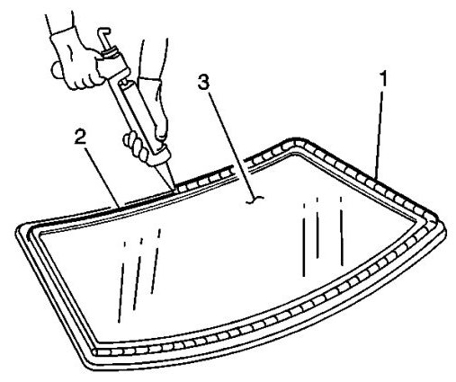 22. Use the edge of the window as a guide for the nozzle in order to apply the urethane adhesive (1) to the inner surface of the window (3).