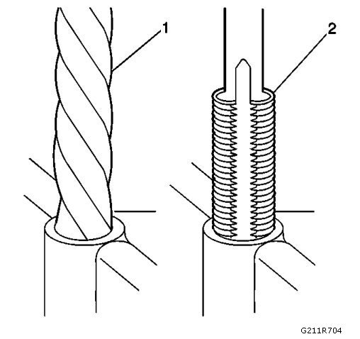 1. Drill out the threads of the damaged hole (1).