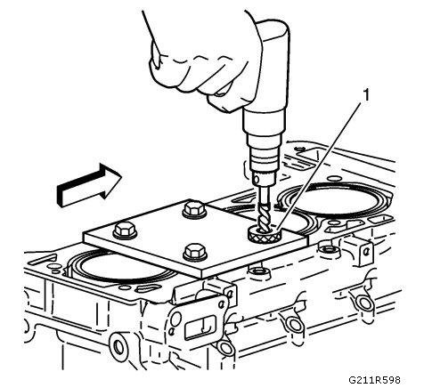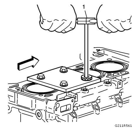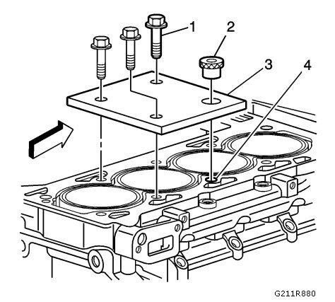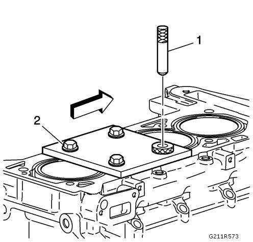Install the fixture plate (3), bolts (1), and bushing (2) onto the engine block deck.