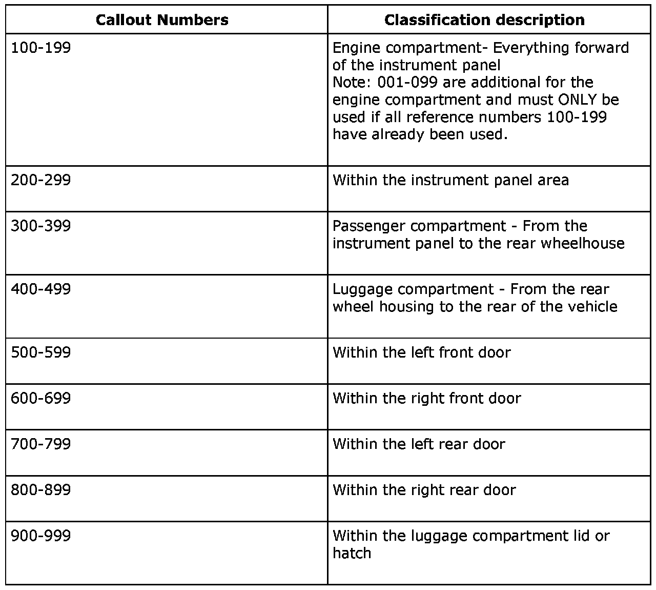 All grounding points, in-line connectors, pass-through grommets, and splices have reference numbers that correspond to where they are located in the vehicle. The table explains the reference number system.