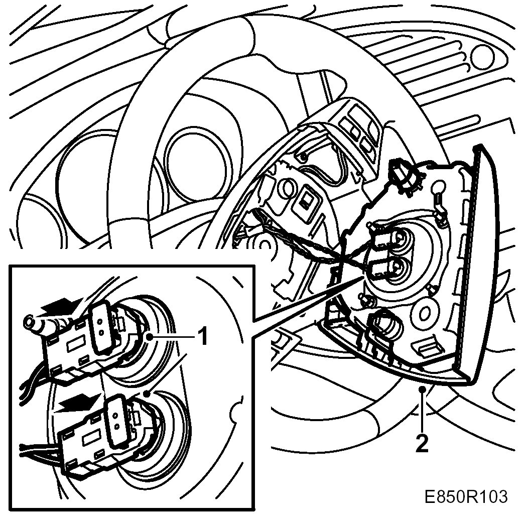 9. Bend the locking spring (2) in with a screwdriver (1) in the hole on the back of the steering wheel.