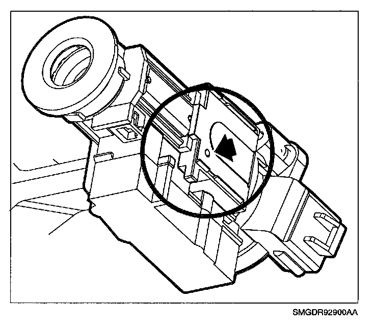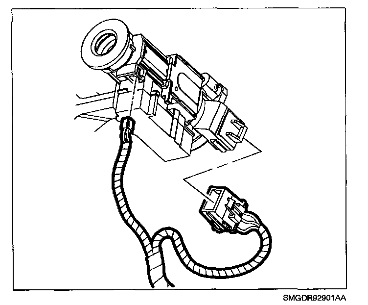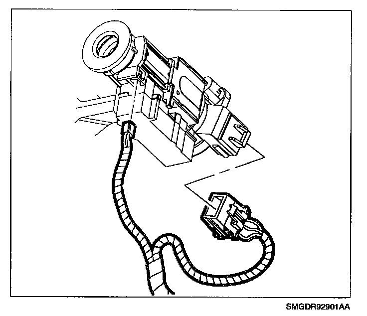 9. Pull ignition module assembly from steering column to access ignition switch connector and park lock cable. Remove ignition switch and disconnect park lock cable from ignition module.