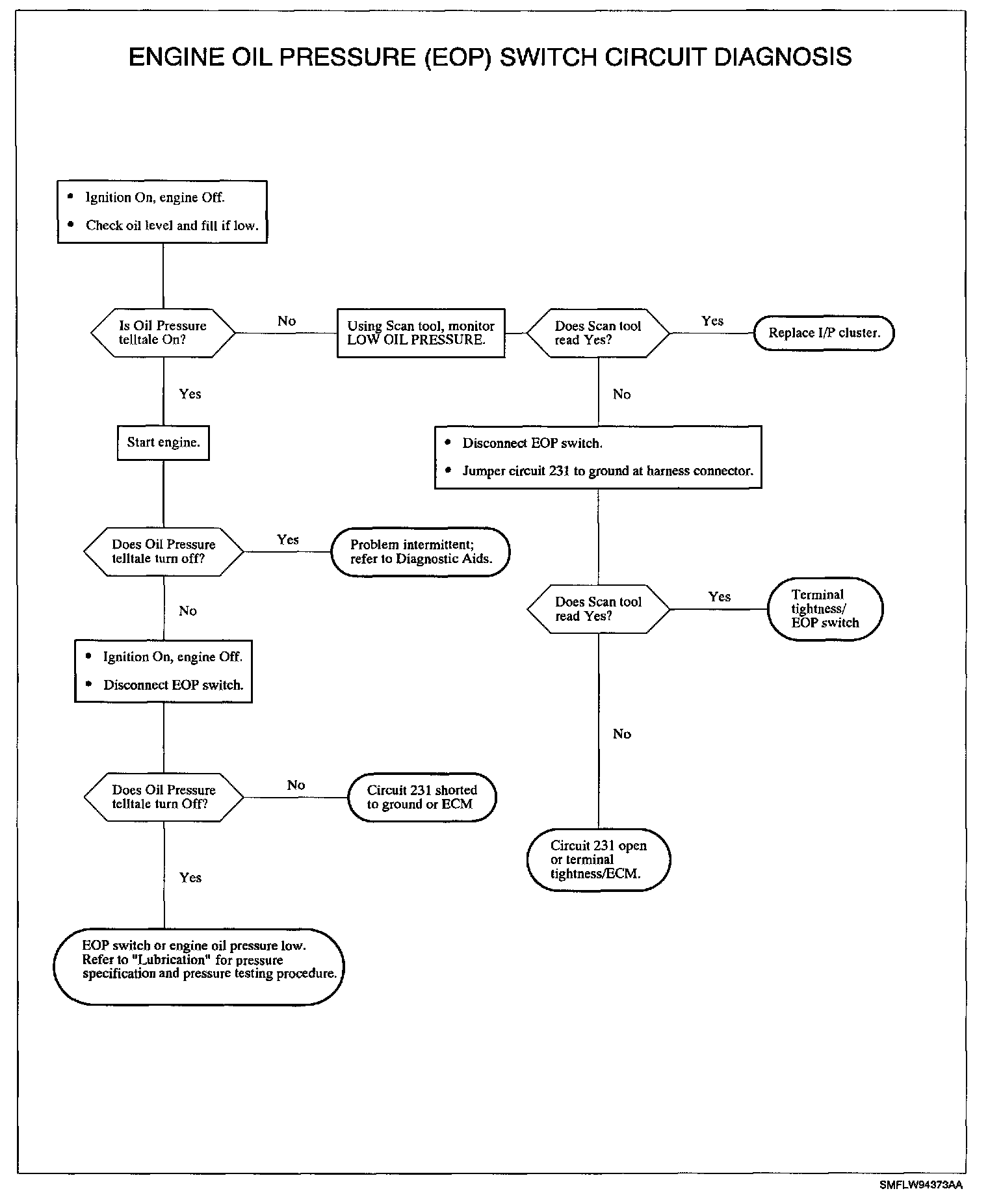 To locate an intermittent problem, use a Scan tool to monitor LOW OIL PRESSURE while grounding and ungrounding circuit 231 at the EOP switch harness connector. The Scan tool should indicate YES when circuit 231 is grounded and NO when circuit 231 is not grounded.