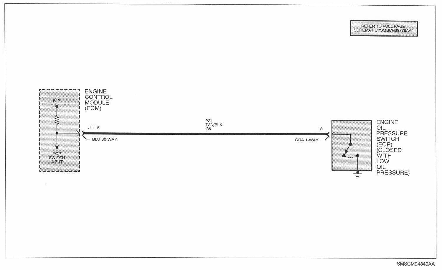 The engine oil pressure (EOP) switch is located in the front of the engine block, underneath the intake manifold. The EOP switch is a normally closed switch that opens when the engine oil pressure exceeds 25 ± 15 kPA (3.6 ± 2.2 psi). The ECM supplies ignition voltage through a pull-up resistor to the EOP switch. With ignition On and engine Off, the ECM EOP input will be low (near 0 volts, switch closed). When the engine is started, and engine oil pressure exceeds 25 ± 15 kPA (3.6 ± 2.2 psi), the switch opens and the ECM EOP input goes high (ignition voltage). The ECM will command the instrument panel ("P") cluster over the Class II link via the CAN BUS to turn On the Oil Pressure telltale whenever the ignition is turned On and the input at the EOP switch is low.