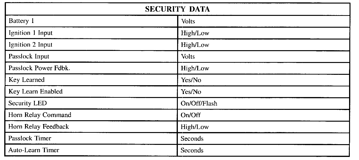 The above table lists the security data directly connected to the body control module (BCM) related to the Passlock System only: