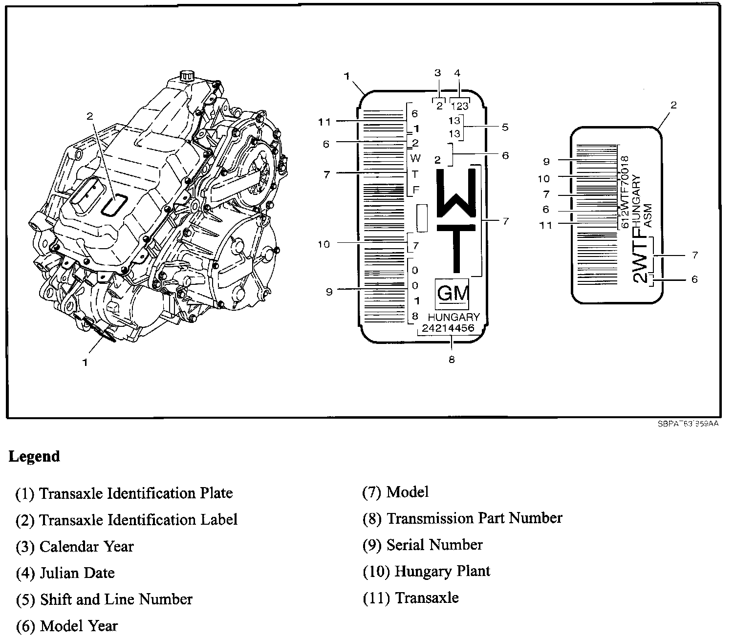 To properly identify the transaxle assembly model year, locate the model year number placement on the metal identification plate (1) and on the identification label (2). The transaxle model year is identified as callout number 6 on the illustration and legend. A number "2" in this position indicates model year 2002. A number "3" indicates model year 2003.
