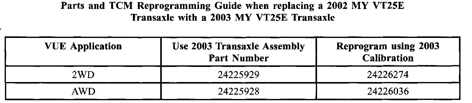 When replacing a 2002 MY VT25E transaxle assembly with a 2003 MY VT25E transaxle assembly into a 2002 MY Saturn VUE vehicle, it is necessary to reprogram the TCM using 2003 MY software and calibrations. The software between the two model years is neither compatible nor interchangeable. Use the Reprogramming Guide shown to determine the correct TCM software for a particular VUE application (2WD or AWD). The guide also lists the applicable 2003 MY VT25E transaxle assemblies.