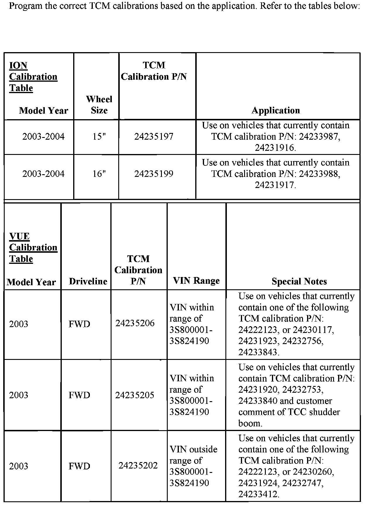 2. Program the TCM with new calibration. Refer to the calibration information table and select the appropriate TCM calibration for the application. Use Saturn Service Stall (SSS) software release TIS 2.5 2005 or higher data CD. For reprogramming procedures, refer to the Service Programming System (SPS) in the SSS Users Guide.