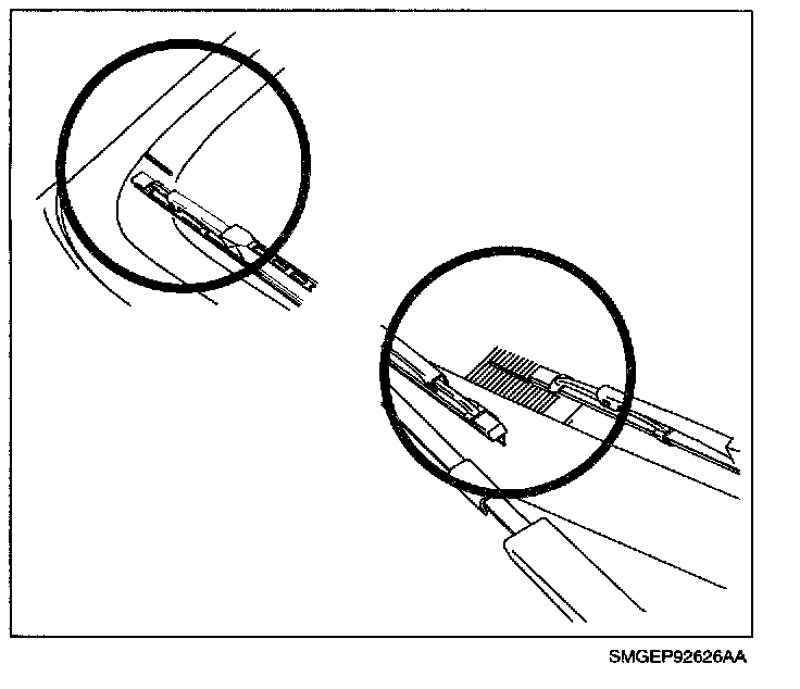 6. On driver's side position wiper blade assembly at tick mark in lower portion of windshield blackout strip.