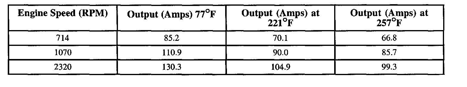 Generator output depends on electrical demand (load), generator temperature and engine speed. When using a charging system tester or a carbon pile tester (carbon pile fully On), the load will be approximately maximum load. The values given below are normal output approximations for SUV generators (generator temperature at 77°F (250°C), 221°F (105°C) and 257°F (125°C)