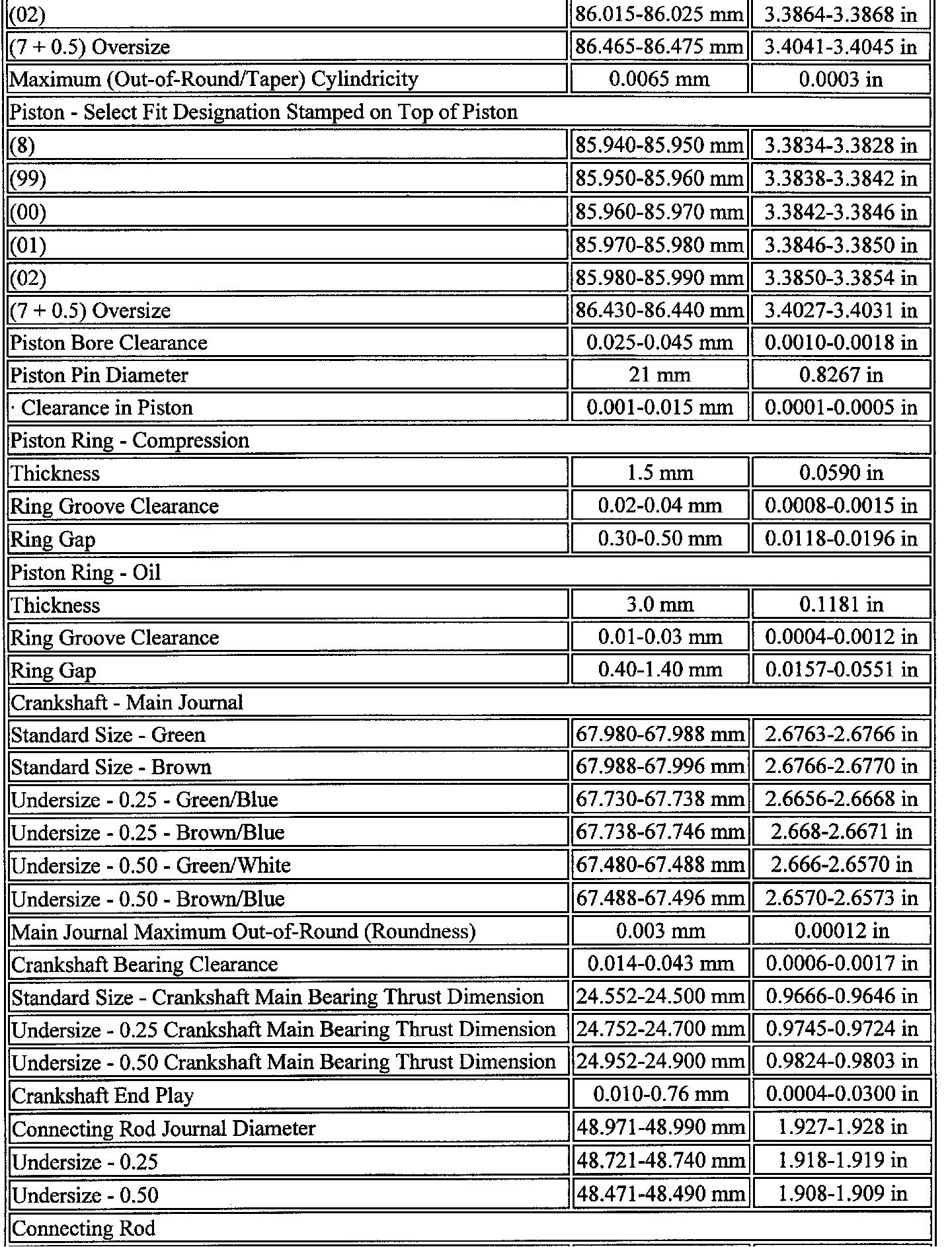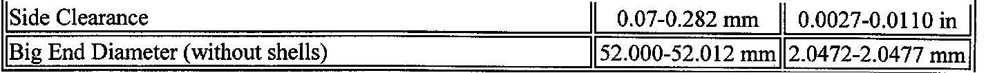 Engine Block Clearance Specifications Continued: