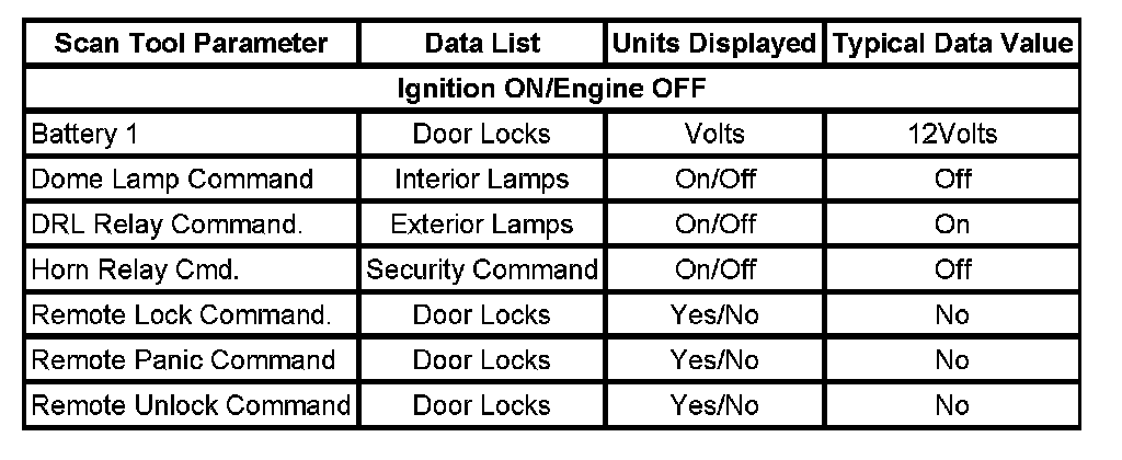 The Keyless Entry Scan Tool Data List contains all of the keyless entry related parameters that are available on the scan tool. The parameters in the list are arranged in alphabetical order. The column, "Data List," indicates the location of the parameter within the scan tool menu selections. Use the Keyless Entry Scan Tool Data List as directed by a diagnostic table or in order to supplement the diagnostic procedures. Begin all of the diagnostic procedures with Diagnostic System Check - Remote Keyless Entry.