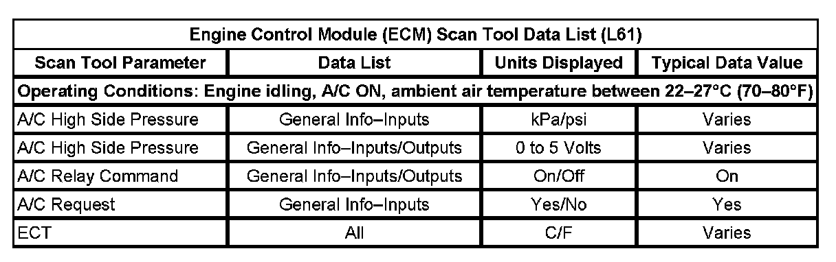 The scan tool data values were taken from a known good vehicle under the following conditions: