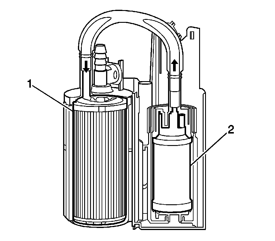 The primary jet pump (1) is located in the primary fuel tank module. Fuel pump flow loss, caused by vapor expulsion in the pump inlet chamber, is diverted to the primary jet pump and the secondary jet pump (2) through a restrictive orifice located on the pump cover. The primary jet pump fills the reservoir of the primary fuel tank module.