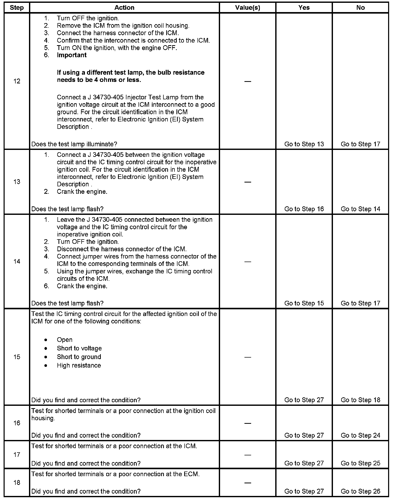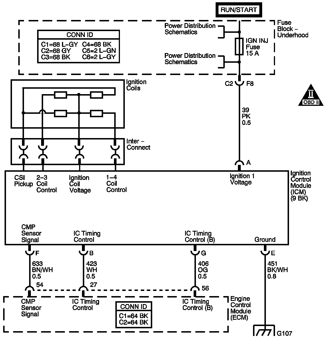 Each ignition coil supplies secondary voltage to a pair of spark plugs. This is called a waste spark ignition system. The engine control module (ECM) supplies a signal on each of the ignition control (IC) timing control circuits to the ignition control module (ICM). The ICM fires the correct ignition coil at the correct time based on the signals. The ICM detects if cylinder 1 or cylinder 3 is on the compression stroke by sensing the secondary voltage and polarity of each side of the ignition coil. The ICM detects this voltage with sensing circuitry integrated into each ignition coil. The higher voltage is on the compressing cylinder. This is called compression sense ignition. The ICM provides a synthesized cam signal to the ECM based on these inputs. The ECM uses the cam signal to synchronize fuel injection.