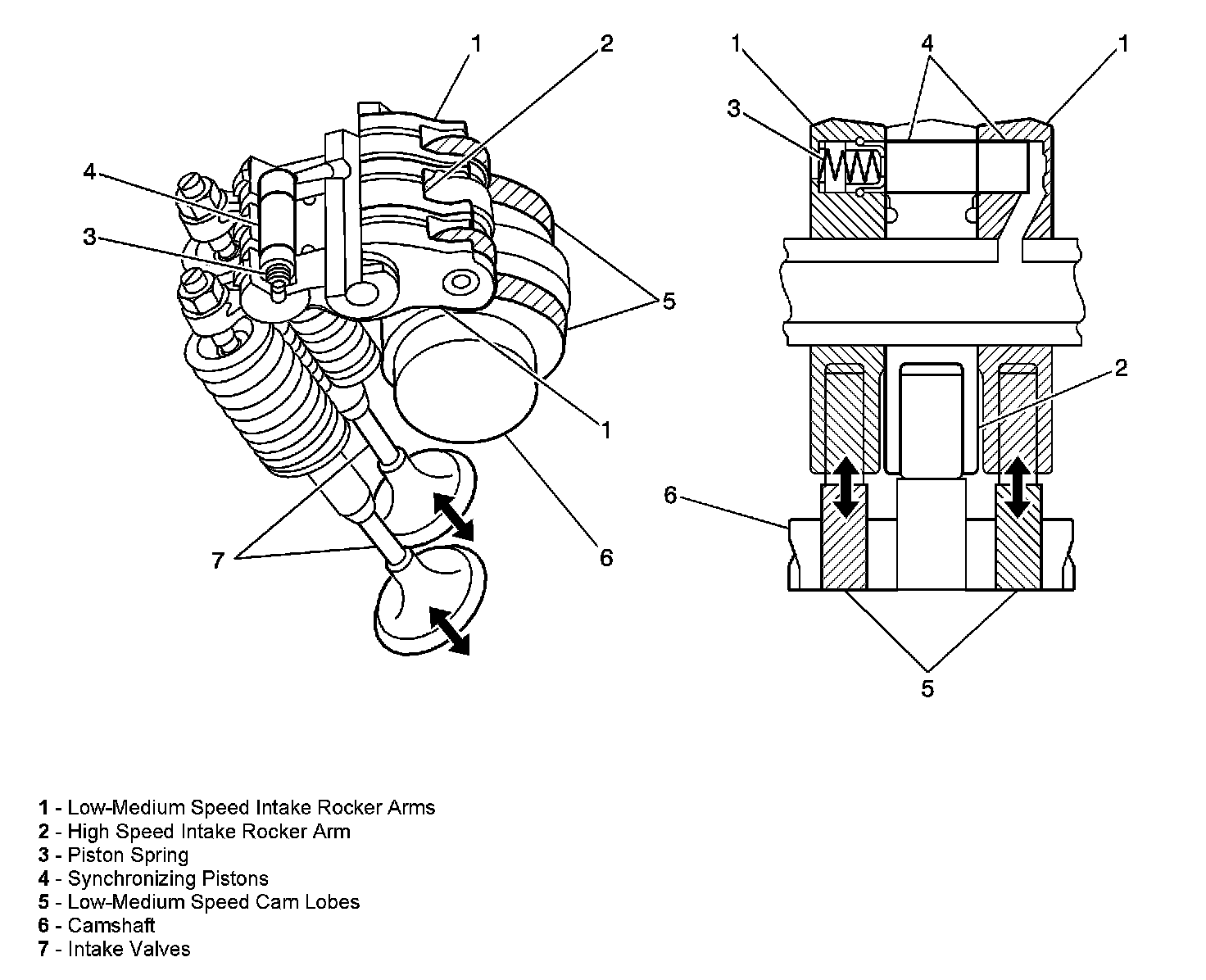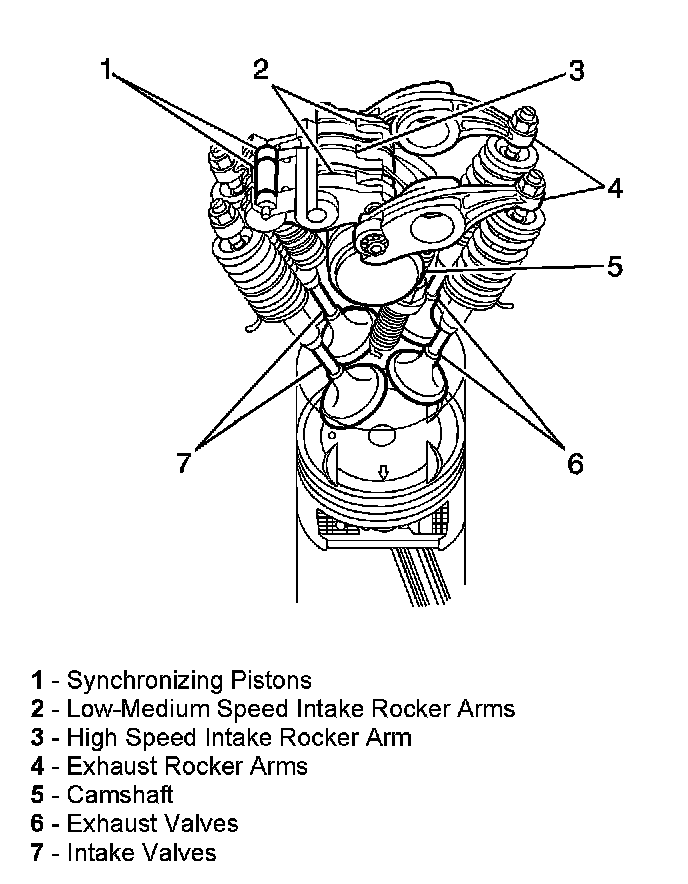 The three intake rocker arms (2 and 3) ride on rocker arm shafts as do the two exhaust rocker arms (4). The rocker arm shafts supply engine oil to the rocker arms. When the flow of oil to the rocker arms increases, the synchronizing pistons (1) move and lock the three rocker arms together. With all three rocker arms locked together, the high speed cam lobe opens and closes the intake valves (7).