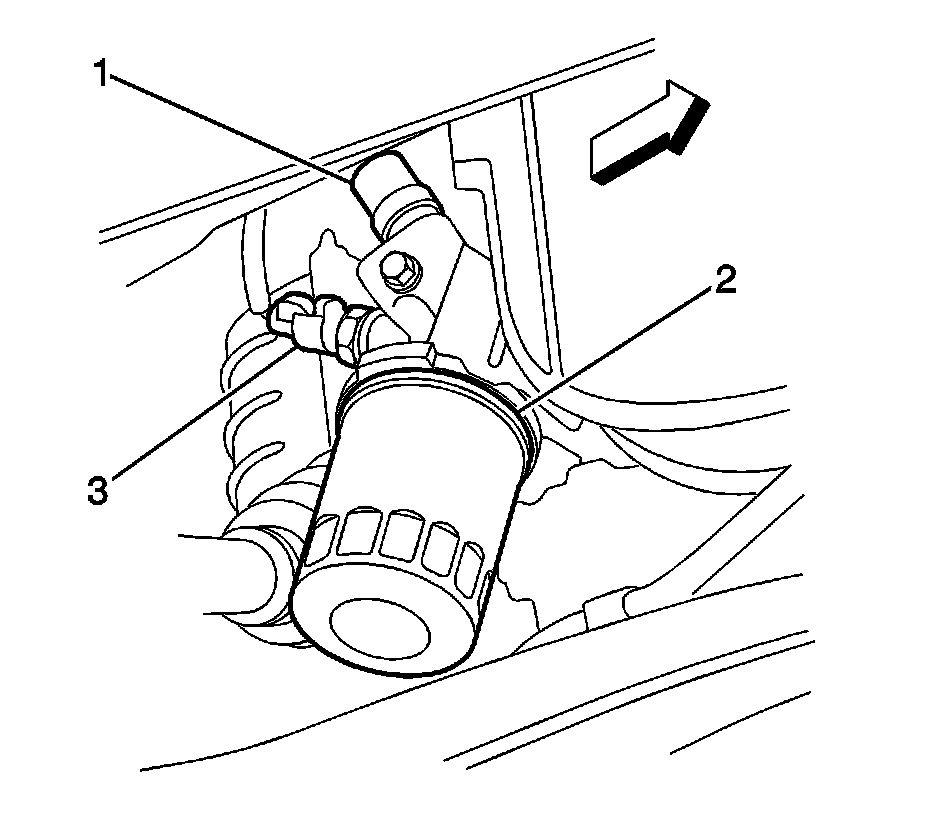 The flow of oil through the rocker shafts to the rocker arms is controlled by the rocker arm oil control solenoid. A rocker arm oil pressure switch monitors the operation of the oil control solenoid. The rocker arm oil control solenoid (1) and the oil pressure switch (3) are located near the engine oil filter (2) on the lower right rear corner of the engine.