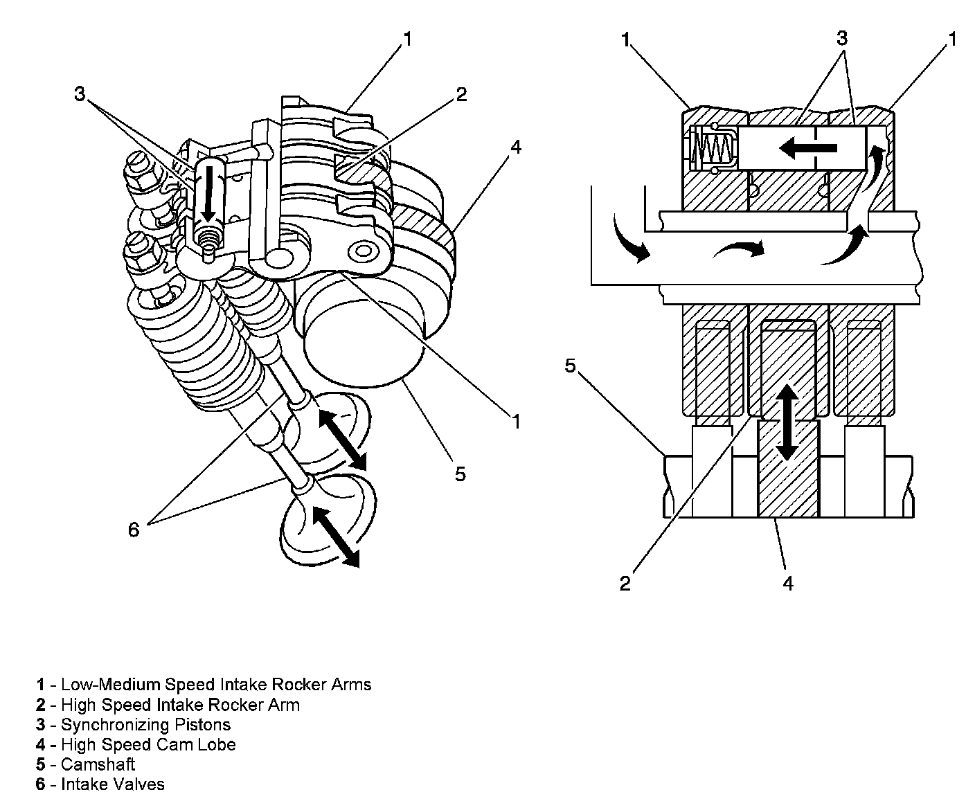 When engine speed exceeds 4,400 RPM engine oil is allowed to flow unobstructed to the rocker arms. This flow of oil into the rocker arm oil passages creates an increase in oil pressure. The increase in oil pressure moves the synchronizing pistons (3) further into their bores, compressing the piston spring. As the spring is compressed, the shifted pistons lock all three rocker arms together (1 and 2). When locked together, the low-medium speed rocker arms (1) follow the movement of the high speed rocker arm (2). Because the high speed rocker arm (2) is following the high speed cam lobe (4), the intake valves (6) open with more lift.