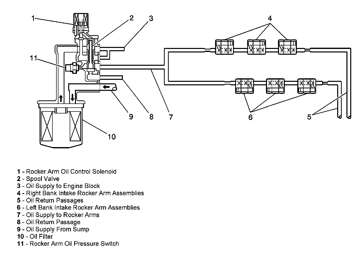 The flow of engine oil thru the rocker shafts to the intake rocker arms (4 and 6) is controlled by the rocker arm oil control solenoid (1). The oil control solenoid (1) has a plunger that moves a spool valve (2) located in the path of the rocker arm oil supply (7). When the oil control solenoid is energized, the spool valve is positioned to allow maximum oil flow to the intake rocker arms. Because of the restriction to full oil flow in the rocker arm oil passages, oil pressure increases. Excess oil is returned to the oil pan thru the oil return passages (5). The rocker arm oil pressure switch (11) detects oil pressure when the rocker arm oil control solenoid (1) is ON. The oil pressure switch input enables the engine control module to monitor the operation of the rocker arm oil control solenoid.
