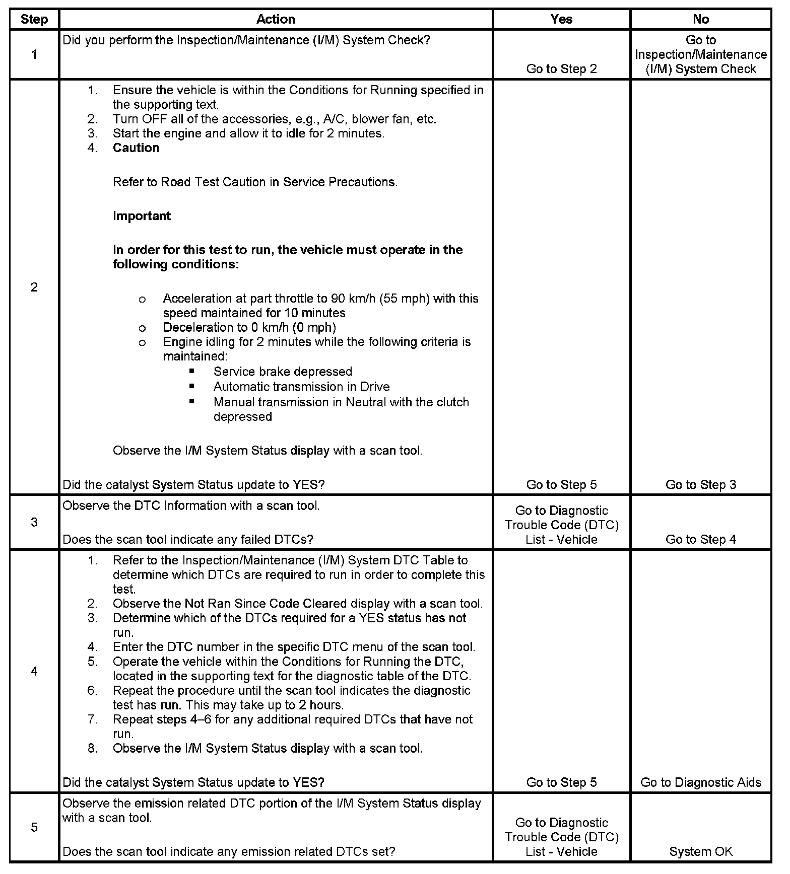 The purpose of this test is to satisfy the enable criteria necessary to execute inspection/maintenance (I/M) readiness diagnostics for the catalyst system. The test may be used to set the I/M System Status indicators to YES. The I/M System Status display on the scan tool provides an indication of whether the control module has completed the required tests. The I/M System Status does not indicate that the tests have passed or failed. When all of the diagnostics for a specific system have run and passed, the I/M System Status will update to YES. If a test for a specific system has failed, the I/M System Status will update to YES, indicating a determination was made even if all of the other tests for that system have not run.