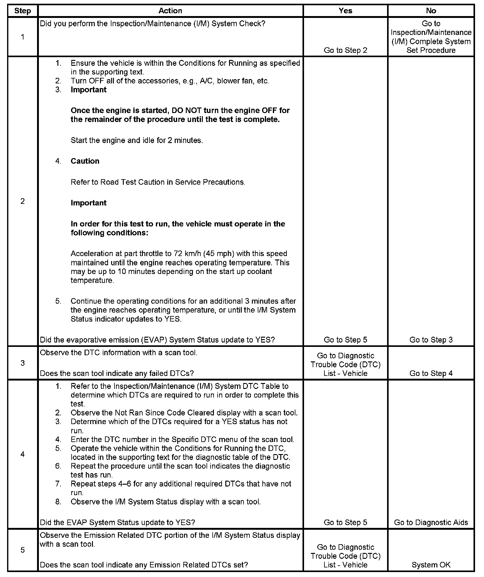 The purpose of this test is to satisfy the enable criteria necessary to execute inspection/maintenance (I/M) readiness diagnostics for the evaporative emission (EVAP) system. The test may be used to set the I/M System Status indicators to YES. The I/M System Status display on the scan tool provides an indication of when the control module has completed the required tests. The I/M System Status does not indicate that the tests have passed or failed. When all of the diagnostics for a specific system have run and passed, the I/M System Status will update to YES. If a test for a specific system has failed, the I/M System Status will update to YES, indicating a determination was made, even if all of the other tests for that system have not run. Performing a visual inspection prior to running the EVAP test may prevent having to repeat the test. A failed or aborted test will require the vehicle to cool down in order to meet the enable criteria to run another test.